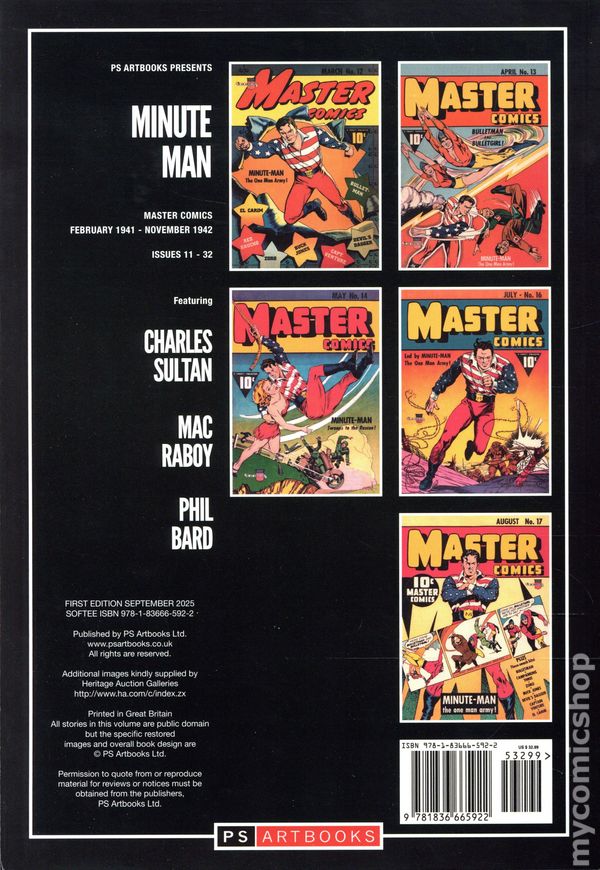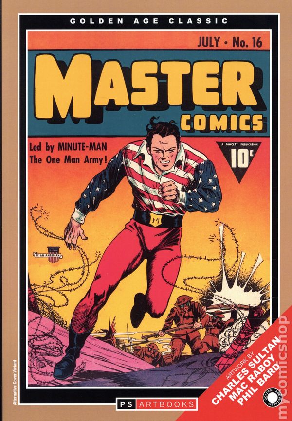 Volume 1 - 1st printing. "February 1941-November 1972!" Collects Stories from Master Comics (1940 Fawcett) #11-32. During World War II, Jack Weston is an army private in prime physical condition who dons a patriotic costume and becomes the Minute Man, a "One Man Army"! He fights enemy agents, including his nemesis femme fatale Illyria, Quenn of the Spies, robot spies, ten foot tall Nazi monsters and agents of the Black Dragon Society. His double identity is known to his superior officer, General Milton, who send the Minute Man on unsanctioned missions behind enemy lines. Featuring Stories by Charles Sultan, Mac Rabor, and Phil Bard. Softcover, 208 pages, full color. Cover price $32.99.
