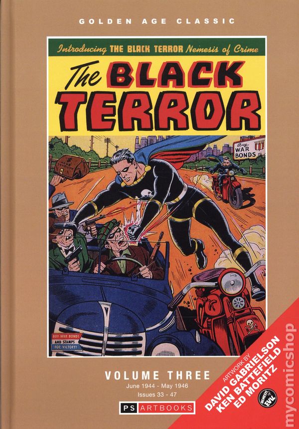 Volume 3 - 1st printing. "June 1944-February 1946!" Collects Exciting Comics (1940-1949) #33-47. Cover by Alex Schomburg. PS Artbooks presents the continuing adventures of The Black Terror - Nemesis of Crime - Volume Three. Bob Benton was a pharmacist working on a tonic to pep people up, who developed formic ethers instead, thanks to a, comment made by his new assistant Tim Roland inspiring him along a new path. Inhaling the vapours from his discovery granted him superhuman strength, which he used to become the crimefighter the Black Terror, battling hoodlums, saboteurs and enemy agents in equal measure. Tim, similarly empowered, became his sidekick - together known as the Terror Twins! Featuring Stories by David Gabrielsen, Elmer Wexler, and Ken Battefield. Softcover, 184 pages, full color. Cover price $32.99.