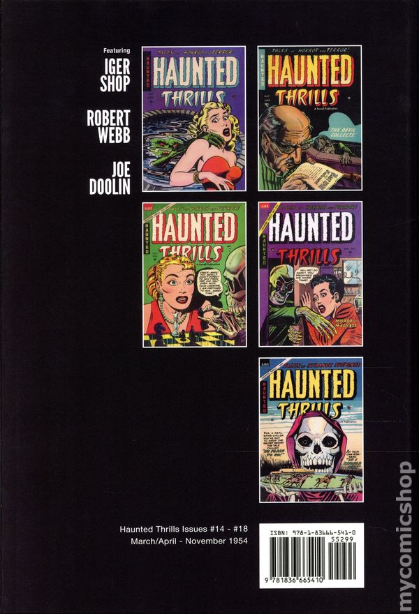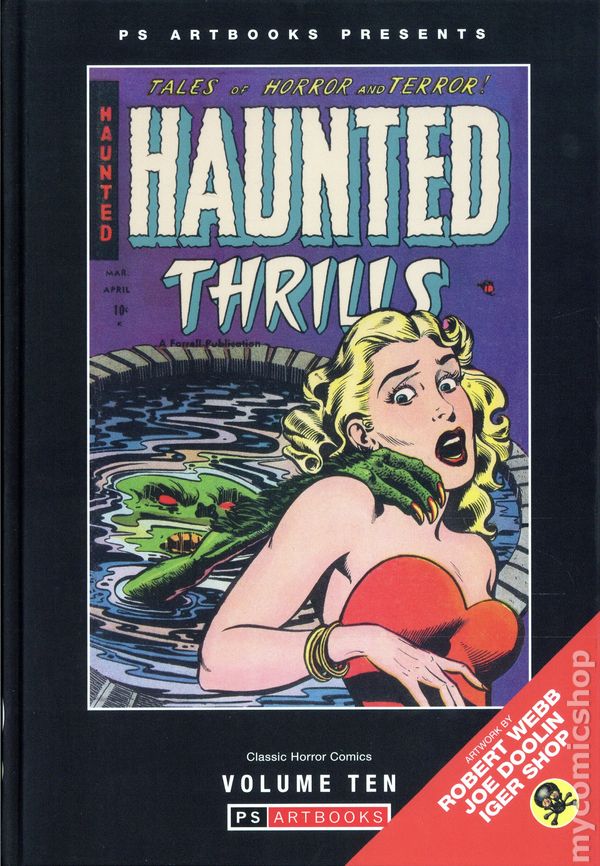 Volume 10 - 1st printing. "March/April-November 1954!" Collects Haunted Thrills (1952-1954) #14-18. Cover by Robert Webb. We've unearthed some more little horrors for Volume 10 of Classic Horror Comics! Beginning with Tales of Horror and Terror-Haunted Thrills #14 where Wanda marries Hubert for his money and betrays him with the chauffeur. When Hubert finds out, he locks her in an ice-cold vault and lets her freeze to death. Just like all the other women who had only married him for his money in "Frigid Fear!". All the way to the end of the run for Haunted Thrills with issue #18 and "No Place to Go" where Wilbur Cummings, a mild-mannered and harmless man, dies after falling down the stair. Neither Heaven nor Hell want to admit him, because he didn't do anything, be it good or evil, so Cumming gets a second chance and is sent back to life! Featuring Stories by Iger Shop, Robert Webb, and Joe Doolin. Hardcover, 184 pages, full color. Cover price $52.99.