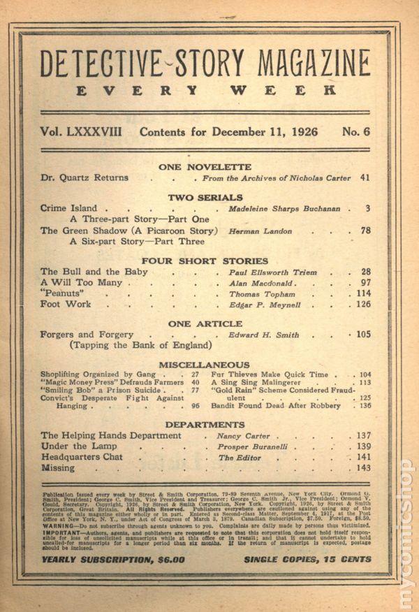 December 18th, 1926. Cover by John A. Coughlin. Novelette "Doomed at Four" by Christopher B. Booth and ongoing serial "Crime Island" part 2 of 3 by Madeleine Sharps Buchanan. Other detective and mystery stories by Philip Hubbard, Frederick Ames Coates, Donald Van Riper, & John Baer. 6.75" x 9.75", 144 pages, B&W. Cover price $0.15.