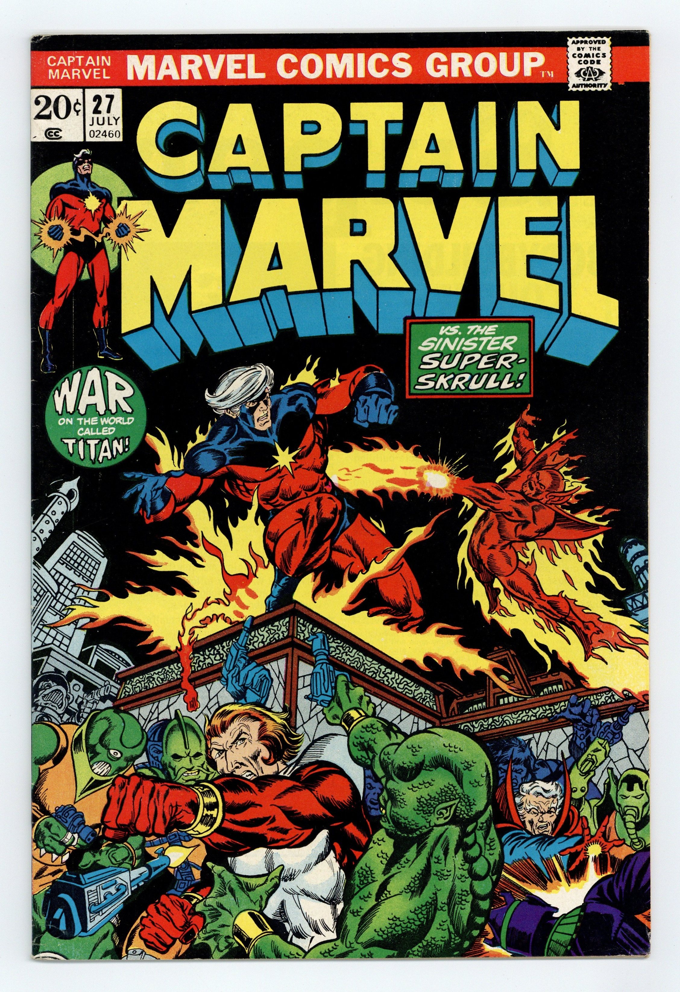 Starts May 4 The Super-Skrull continues to pester Captain Marvel in "Trapped on Titan!" Script by Mike Friedrich, plot and pencils by Jim Starlin, inks by Pablo Marcos. Meanwhile, Thanos seeks out the Cosmic Cube. Cameos by the Thing (of the Fantastic Four), the Avengers (Captain America, Iron Man, the Scarlet Witch, the Vision, and the Black Panther), and Drax the Destroyer. This issue also contains a map of Titan. Cover price $0.20.