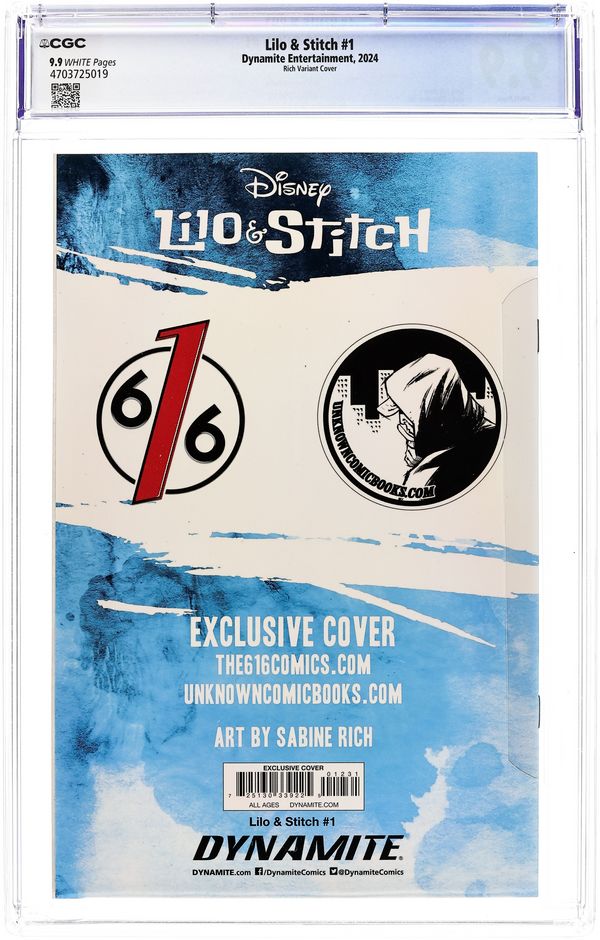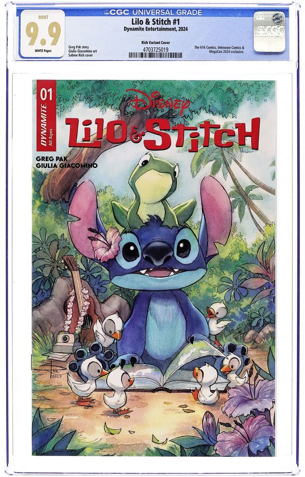 THE 616 Comics and Unknown Comics Exclusive Variant Cover by Sabine Rich. Written by Greg Pak. Art by Giulia Giacomino. Get ready for a new adventure with LILO & STITCH as the irrepressible pair launch their very first ongoing comic series, brought to you by superstar writer GREG PAK (Darth Vader, Mech Cadets) and artist GIULIA GIACOMINO! Life seems to have calmed down for Experiment 626 and his new family on Earth - at least until evil aliens come hunting for everyone's favorite blue-furred troublemaker. The kicker? They're using giant robots that are powered by Stitch's own DNA! Will Lilo's beloved pet be able to take on these villains and lead them away from his adopted planet and loved ones? And even if he succeeds, will he be able to find his way back home? 32 pages, full color.