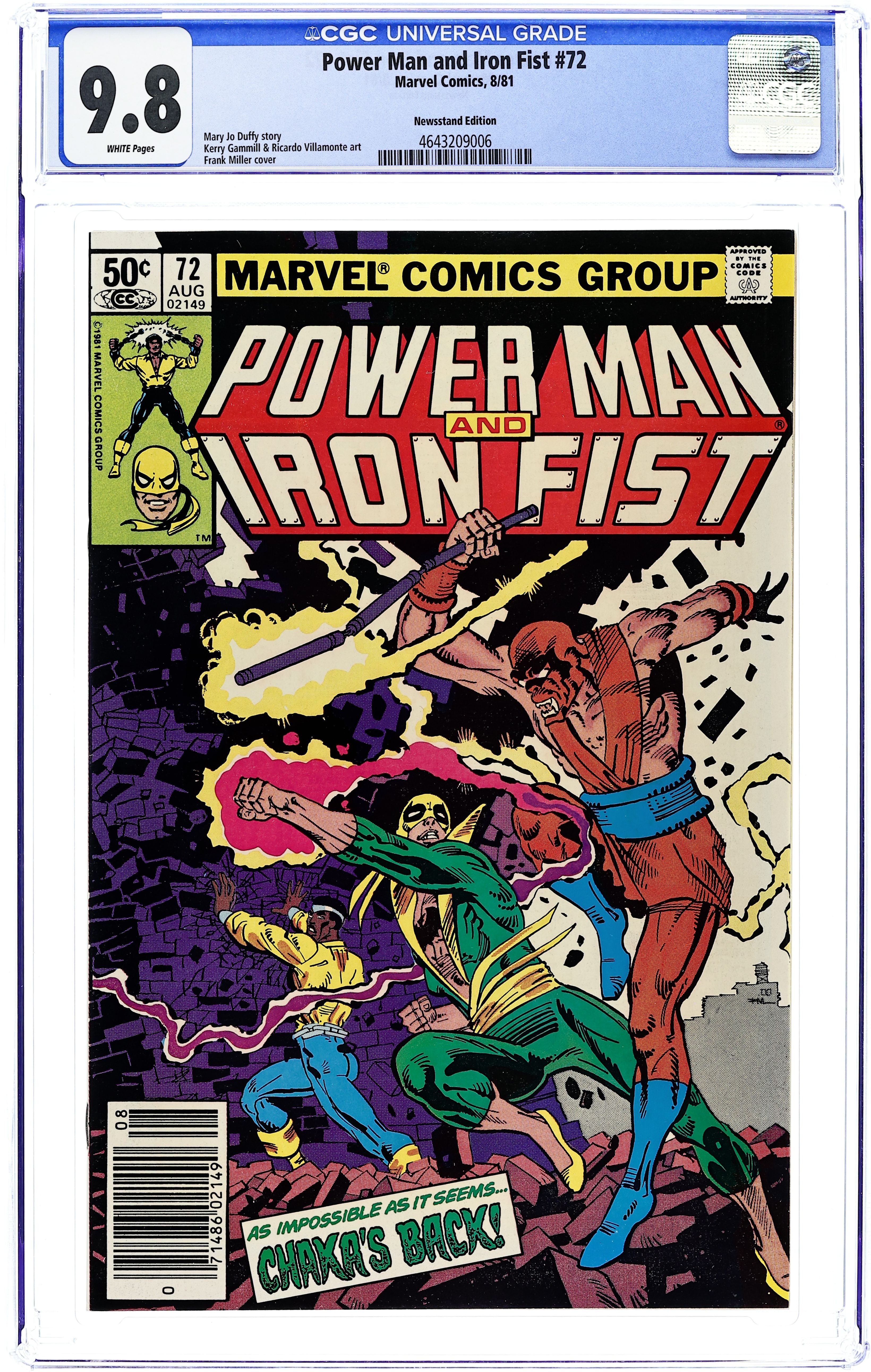 Newsstand Edition. Story by Mary Jo Duffy. Art by Kerry Gammill and D. Hands. Frank Miller cover. Have Power Man and Iron Fist finally met their match? They face an enemy who can out maneuver them at every turn. It will take their best teamwork to defeat Montenegro the man from the Black Mountain. 32 pages. Cover price $0.50.