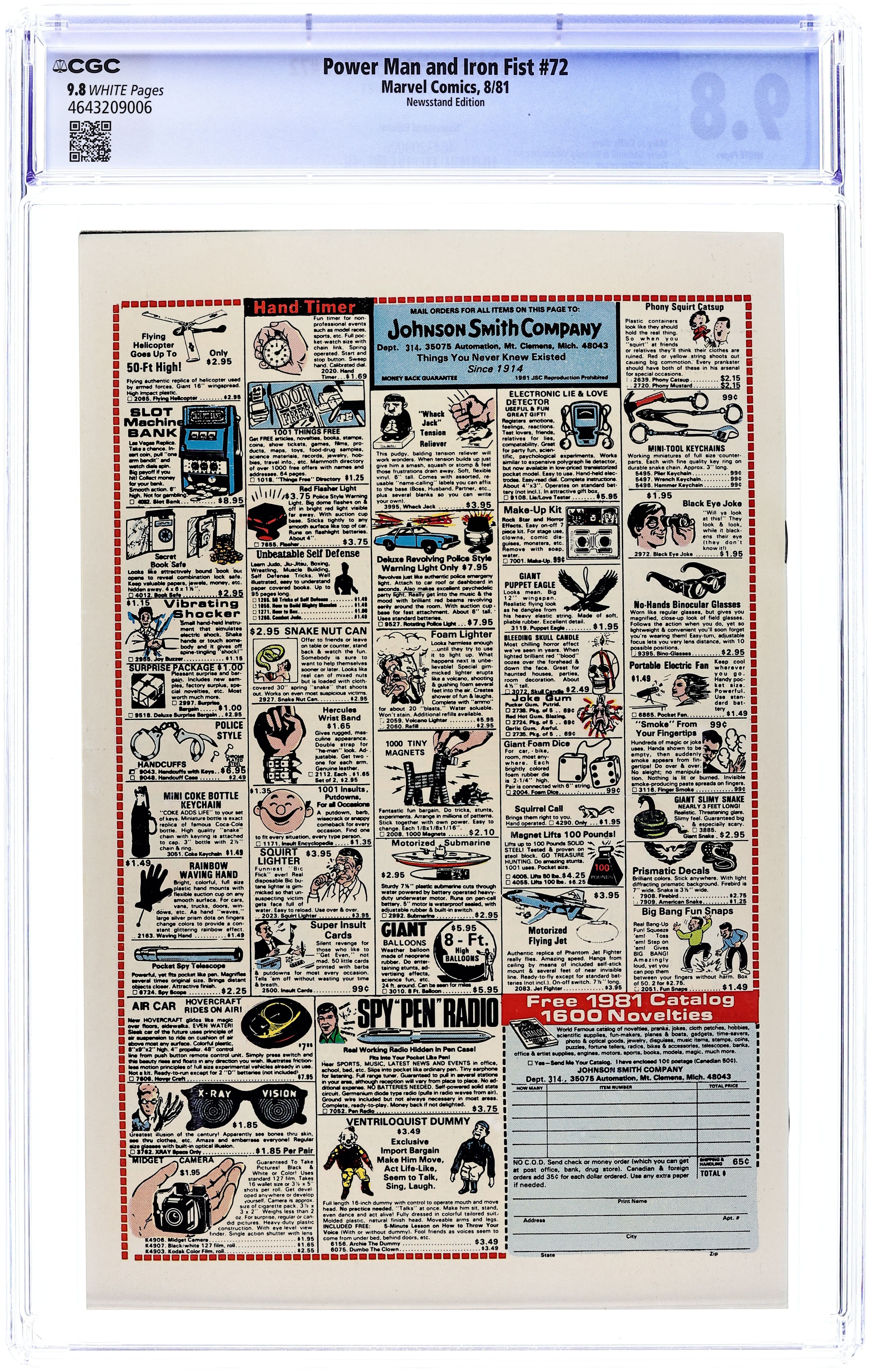 Newsstand Edition. "Who's Been Sleeping in my Grave?" Part 1 of 2. Story by Mary Jo Duffy. Art by Kerry Gammill and Bruce Patterson. Big Ben, a rival from Luke Cage's past, comes crashing through the door, assassins hot on his heels, seeking his old sparring partner's help. Meanwhile, a misunderstanding sets Iron Fist against another old friend of Power Man's, the super-fast Thunderbolt. Cover price $0.40.