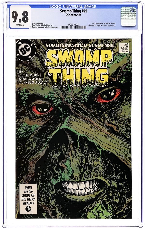 Newsstand Edition. In the penultimate chapter of the American Gothic, Swamp Thing gathers forces to battle the monstrous evil that's vanquishing the world! Guest-starring Deadman, John Constantine and more! Written by Alan Moore, with art by Stan Woch and Alfredo Alcala. Cover by Stephen Bissette and John Totleben. Cover price $0.75.