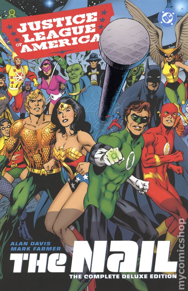 1st printing. Collects Justice League: The Nail (1998) #1-3 and Justice League of America: Another Nail (2004) #1-3. Written by Alan Davis. Art and cover by Alan Davis and Mark Farmer. Introduction by Alan Davis. IN A WORLD WITHOUT A JUSTICE LEAGUE, WHO WILL DEFEND US? Formed by the Worlds Greatest Heroes, the Justice League of America stands tall as the mightiest group of protectors Earth has to offer. Since the groups founding, one hero above all others has stood as their inspiration, guiding light, and moral center: Superman. Now imagine a world without the Man of Steel. Welcome to the alternate history of JLA: The Nail. In a fascinating story of tiny accidents that cascade into cataclysmic disasters, writer/artist Alan Davis (Batman and the Outsiders) joined by legendary inker Mark Farmer (Legion of Super-Heroes) creates a world that never knew a Superman and a Justice League that is about to face their greatest test of might and morality. All because of something as simple as a nail. Hardcover, 7 1/2-in. x 11-in., 312 pages, full color. Teen Cover price $49.99.