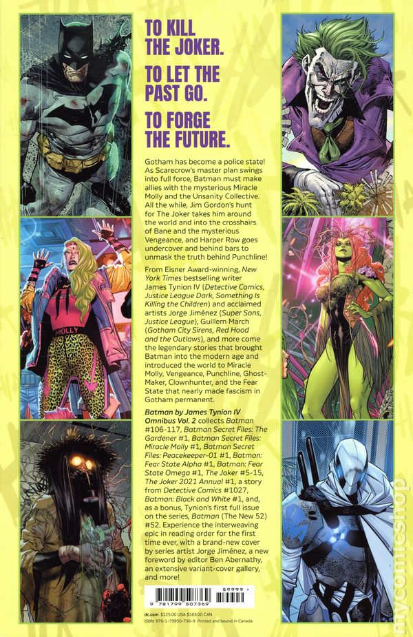 Volume 2 - 1st printing. Collects Batman (2016 3rd Series) #106-117, Batman Secret Files: The Gardener (2021 DC), Batman Secret Files: Miracle Molly (2021 DC), Batman Secret Files: Peacekeeper-01 (2021 DC), Batman: Fear State: Alpha (2021 DC), Batman: Fear State: Omega (2021 DC), The Joker (2021 DC) #5-15, The Joker (2021 DC) Annual #1, a story from Detective Comics (2016 3rd Series) #1,027, and Batman (2011-2016 2nd Series) #52. Written by James Tynion IV, Sam Johns, Matthew Rosenberg, and Ed Brisson. Art by Jorge Jimenez, Giuseppe Camuncoli, Francesco Francavilla, Guillem March, Christian Ward, Riley Rossmo, Dani, Sweeney Boo, Belen Ortega, Riccardo Federici, Joshua Nixson, Stefano Raffaele, Rosi Kampe, Bengal, Tradd Moore, Trevor Moore, Trevor Hairsine, Ryan Benjamin, Christian Duce, Cam Smith, Lorenzo Ruggiero, Brian Level, and Andriano Di Benedetto. Cover by Jorge Jimenez. BESTSELLING AND ACCLAIMED WRITER JAMES TYNION IV'S INTERWEAVING BATMAN AND JOKER EPIC COMES TO ITS GROUNDBREAKING CONCLUSION! Gotham has become a police state! As Scarecrows master plan swings into full force, Batman must make allies with the mysterious Miracle Molly and her resistance group. All the while, Jim Gordons hunt for The Joker takes him around the world and into the crosshairs of Bane, and Harper Row must go undercover to unmask the truth behind Punchline! Experience the finale of the interweaving epic in reading order for the first time ever. Hardcover, 8 1/2-in. x 11-in., 1,000 pages, full color. Teen Cover price $125.00.