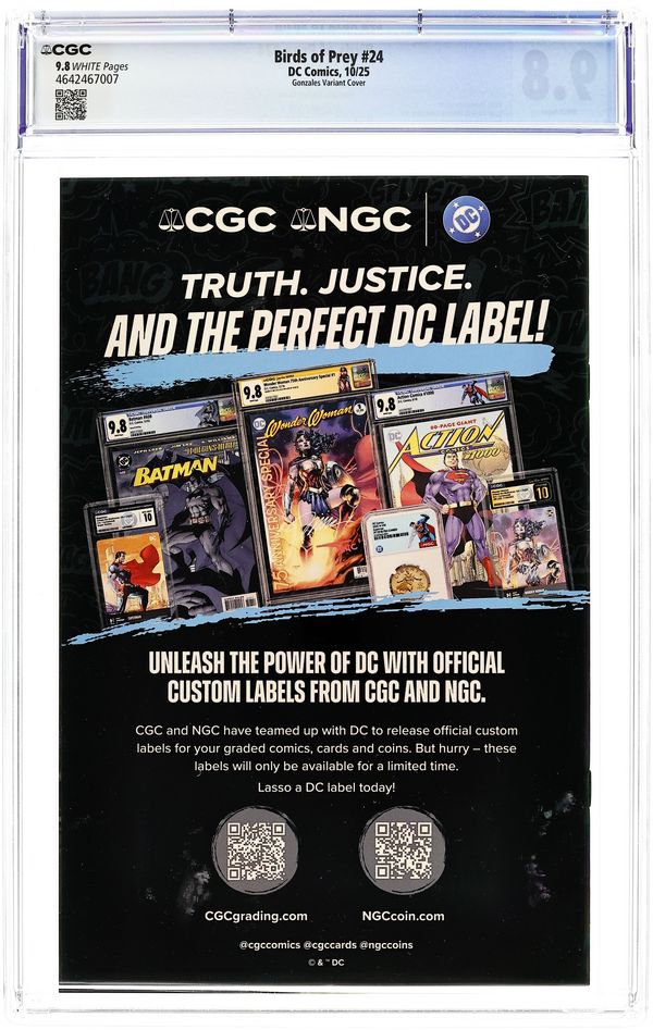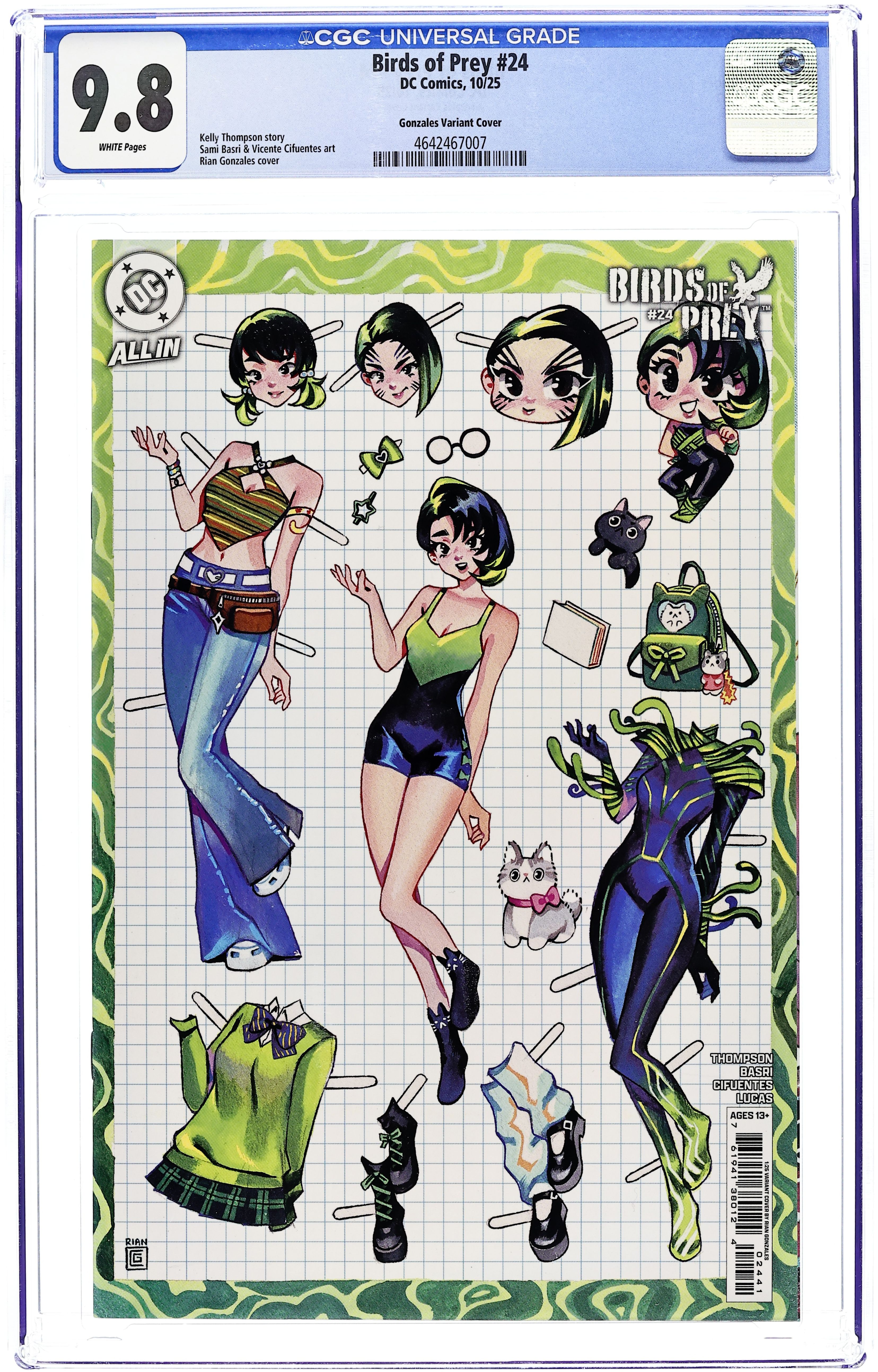 Limited 1 for 25 Retailer Incentive Variant Cover. Written by Kelly Thompson. Art by Sami Basri. Cover by Rian Gonzales. The Birds of Prey are back to business as they infiltrate The Ninth Day, a mysterious corporation the Birds believe has kidnapped people--including Amazons that have gone missing. When their spy on the inside, an undercover Cassandra Cain, breaks contact, it'll be up to Oracle, Black Canary, Big Barda, Megaera, and newcomers Grace Choi and Onyx to bust her out. Don't miss the start of this thrilling new arc, where the fate of the Amazons rests in the hands of a silent warrior! 32 pages, full color. Rated T+ Cover price $4.99.