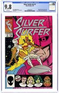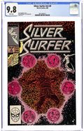 Newsstand Edition. "Aftermatch!" Guest-stars galore. Story by Steve Englehart. Art by Ron Lim, Joe Rubinstein, and Tom Christopher. In this transition issue the Silver Surfer wonders if he is destined to roam the space ways alone, Firelord and Starfox continue their pursuit of Nebula, the Kree arrive on Zenn-La, the Super Skrull lets the universe know he's back, and following the events of Avengers West Coast (1985) #39, Mantis longs for the Surfer. Plus, Galactus feeds. 32 pages. Cover price $1.00.