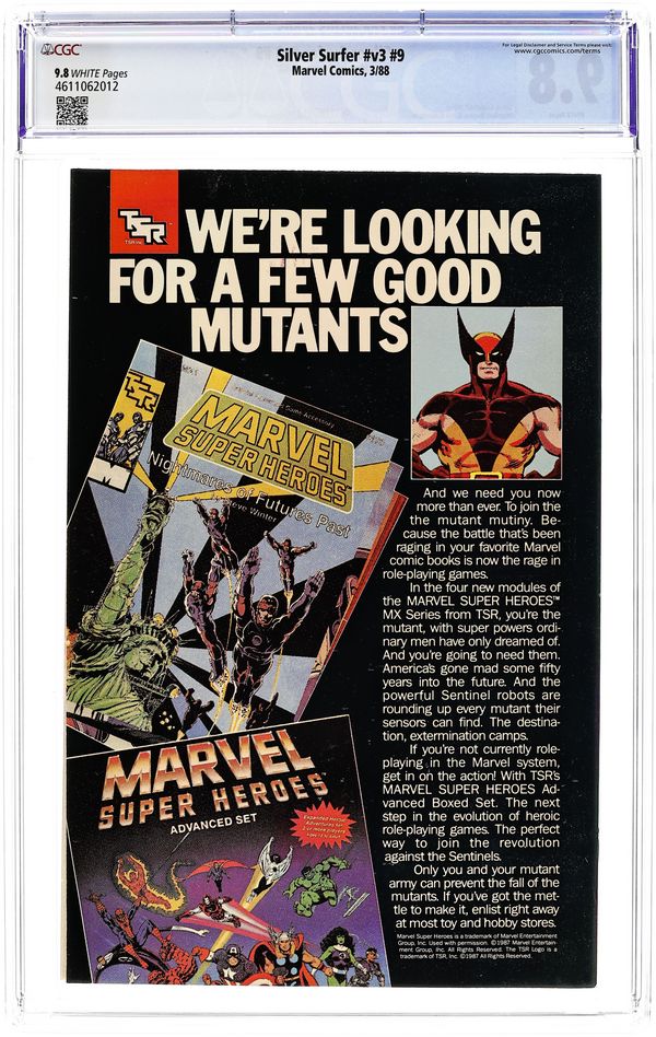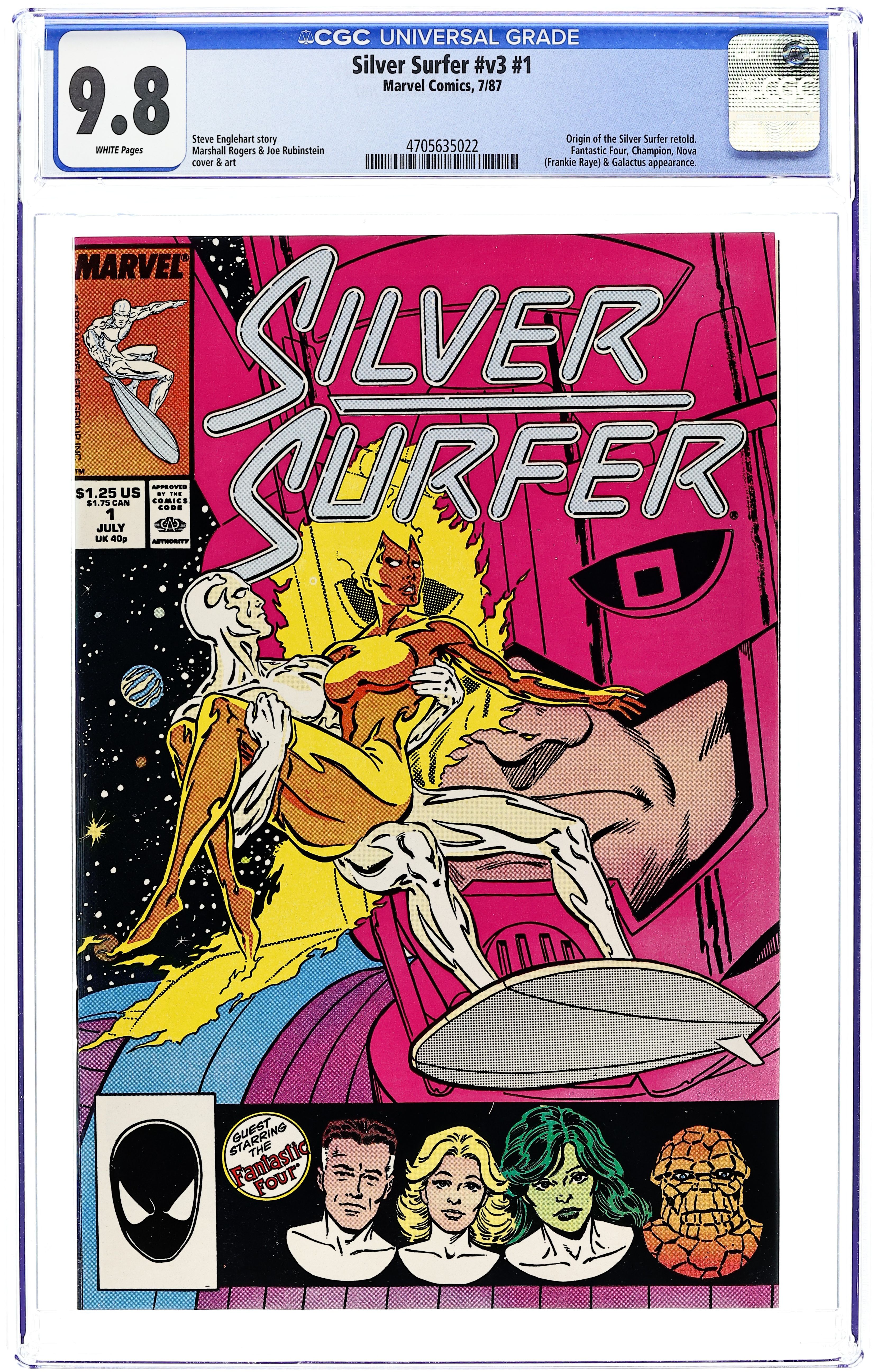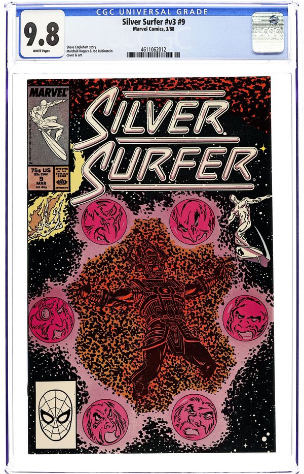 "Galactic Grapplerama!" Guest-starring Legacy (Captain Marvel III). Story by Mike Lackey. Art by Tom Grindberg and Bill Anderson. The Silver Surfer fights for his life against the nefarious Doctor Doom. Meanwhile, Galactus confronts an ancient enemy from his past in a battle that could decide the fate of the universe. Cover price $1.50.