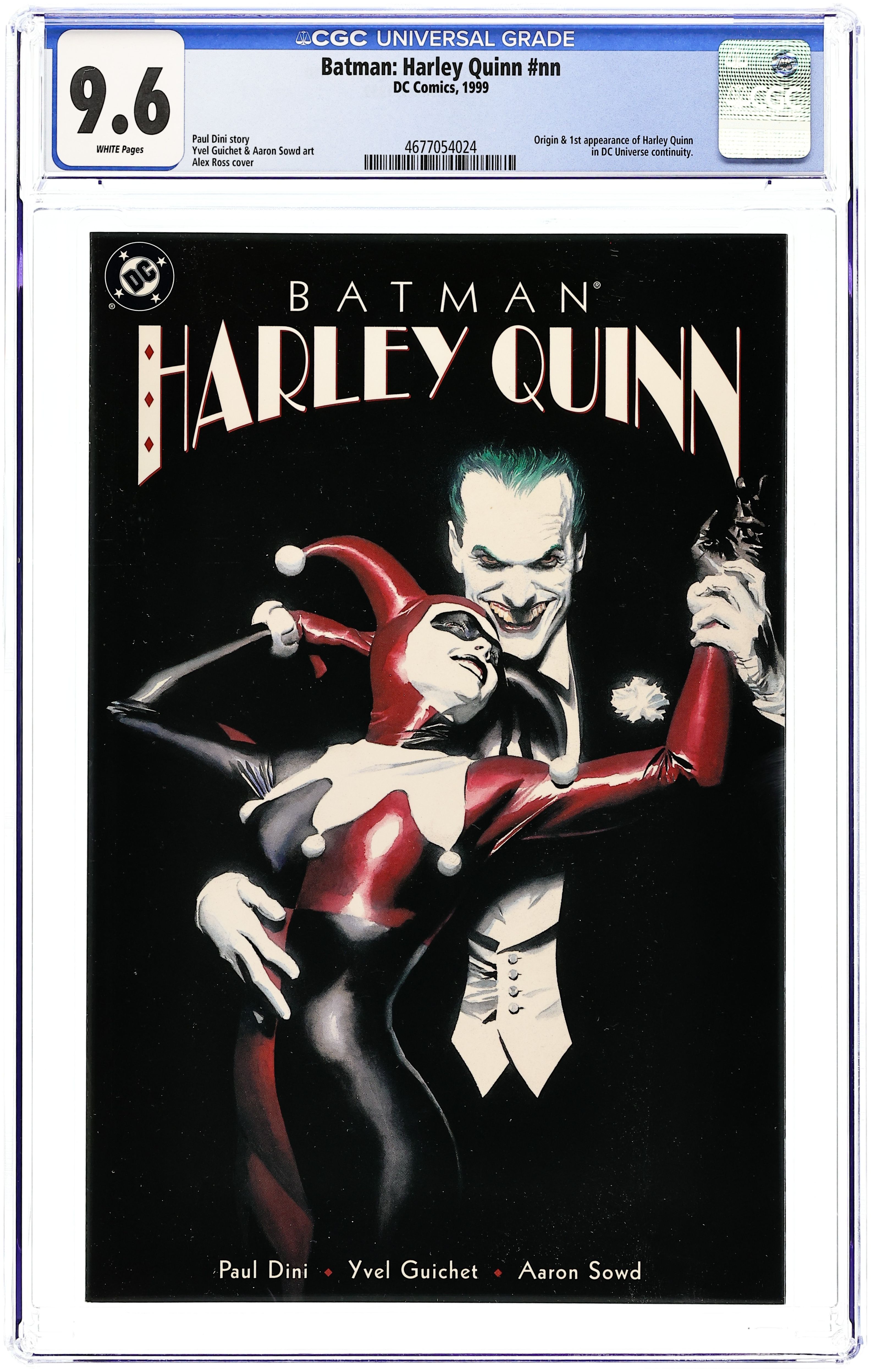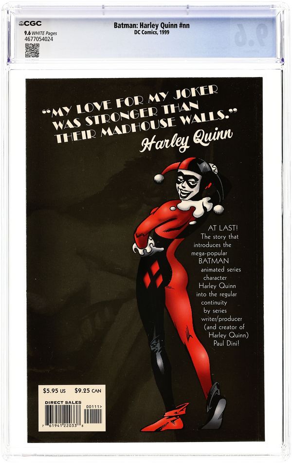 1st Printing (2nd and 3rd printings have 2nd and 3rd printing notices on inside front cover). Written by Paul Dini; art by Yvel Guichet and Aaron Sowd; painted cover by Alex Ross. The most popular character introduced in Batman's animated adventures enters the DC Universe and "No Man's Land" in a Prestige one-shot written by Harley's creator, Paul Dini (SUPERMAN: PEACE ON EARTH), with a painted cover by PEACE ON EARTH's Alex Ross and stunning interiors by Yvel Guichet and Aaron Sowd. Since Gotham's fall, the Joker has been relatively quiet...but that's about to change as former Arkham Asylum doctor Harleen Quinzel joins the Clown Prince of Crime to put him back on top. But when their unusual partnership leaves Harley a little worse for wear, she enlists Poison Ivy's help. Now the Joker and Batman are going to learn that this souped-up Harley's not going to be pushed around anymore. Prestige Format. FC, 52 pg.$5.95" Batman No Man's Land Cover price $5.95.