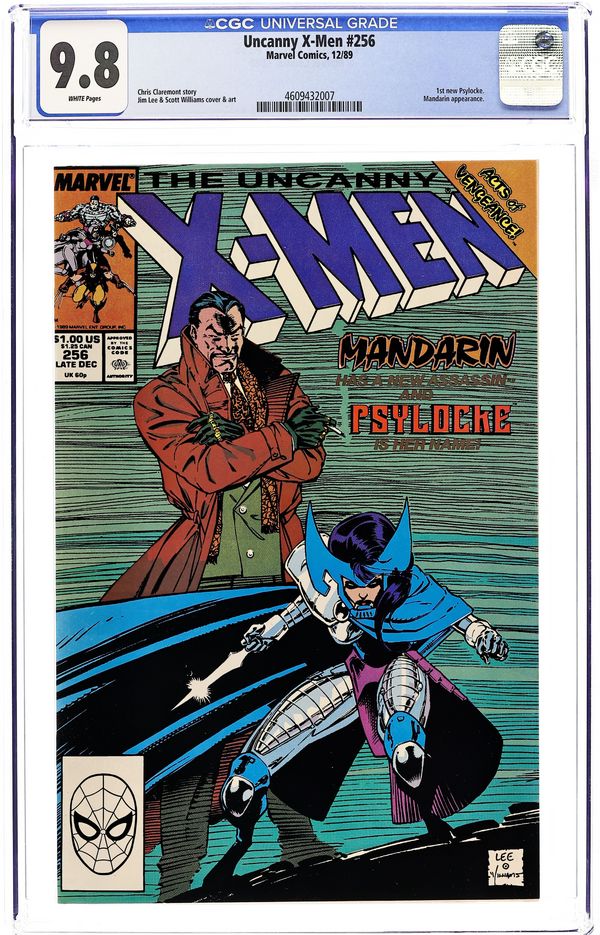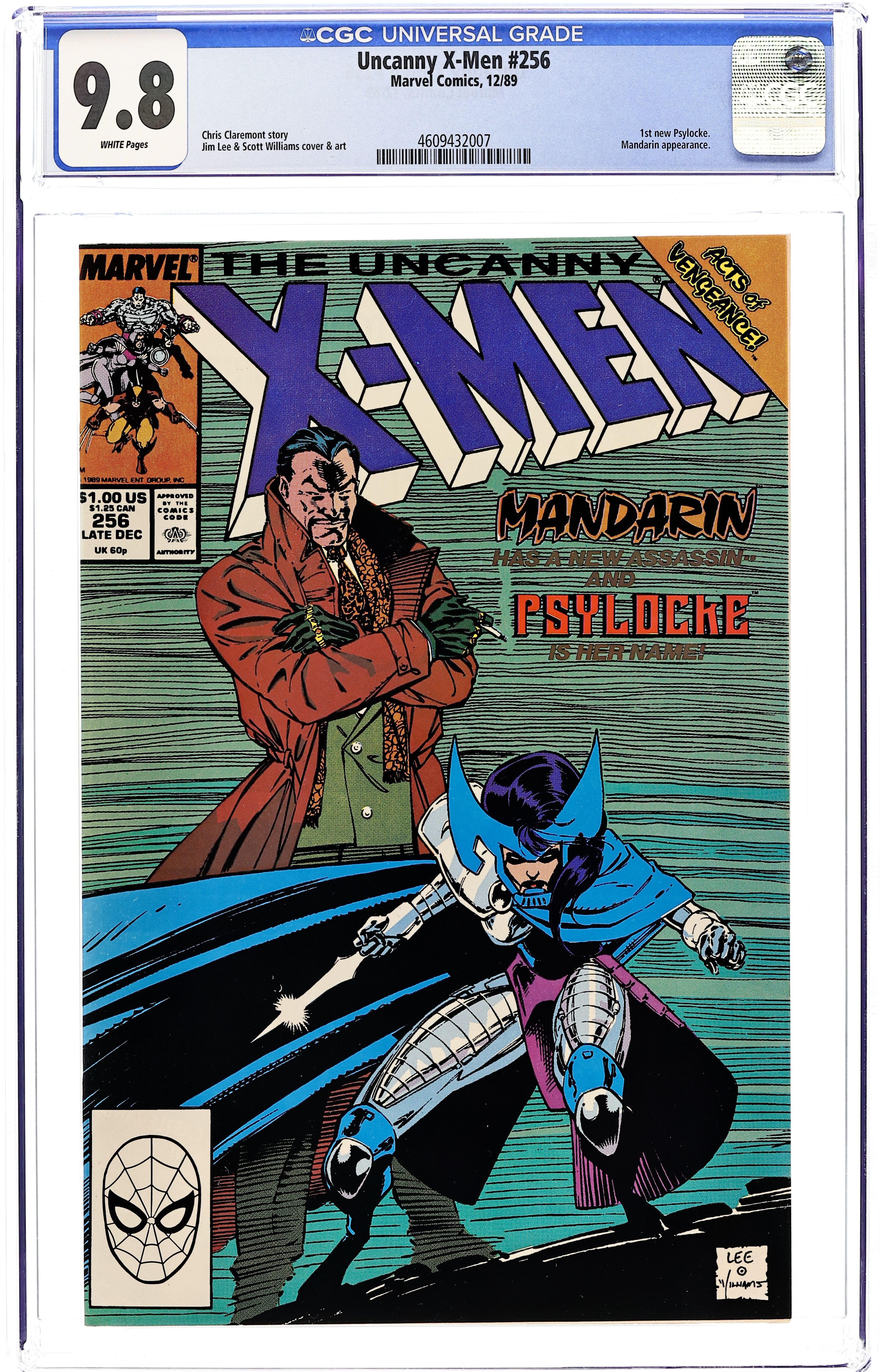 Direct Edition. Acts of Vengeance: Part 1 of 3. "The Key that Breaks the Locke!" Story by Chris Claremont. Art and cover by Jim Lee and Scott Williams. A cabal made-up of some of Marvel's most dangerous villains has gathered together to pull their resources and finally destroy the heroes who oppose them. This inner circle consists of Doctor Doom, Magneto, the Kingpin, Wizard, Red Skull, the Mandarin, and a mysterious benefactor. Their plan is to surprise their enemies with foes whom they've never faced. In this issue, Iron Man's arch nemesis the Mandarin takes on a new apprentice - Lady Mandarin! The X-Men know her as Psylocke. NOTE: 1st appearance of the ninja Psylocke. 36 pgs. Cover price $1.00.