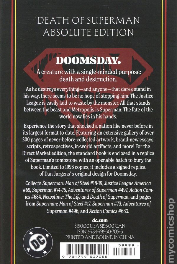 1st printing. Collects Superman: The Man of Steel (1991-2003) #18-19, Justice League America (1987-1996) #69, Superman (1987-2011 2nd Series) #74-75, The Adventures of Superman (1987-2006) #497, Action Comics (1938-2011 DC) #684, and pages from Superman: The Man of Steel (1991-2003) #17, Superman (1987-2011 2nd Series) #73, The Adventures of Superman (1987-2006) #496, and Action Comics (1938-2011 DC) #683. Written by Dan Jurgens, Jerry Ordway, Louise Simonson, and Roger Stern. Art by Jon Bogdanove, Tom Grummett, Jackson "Butch" Guice, Dan Jurgens, Brett Breeding, Rick Burchett, Doug Hazlewood, Dennis Janke, and Denis Rodier. THE LANDMARK STORY THAT CHANGED COMICS FOREVER IS BIGGER THAN EVER! AND JAM-PACKED WITH GOODIES AND EXTRAS! Written by Dan Jurgens, Roger Stern, Louise Simonson and Jerry Ordway Art by Dan Jurgens, Jon Bogdanove, Tom Grummett, Butch Guice and More Experience The Death of Superman like never before, in its largest format to date! Featuring an extensive gallery of over 200 pages of never-before-seen artwork, brand-new essays, scripts, retrospectives, a trading card gallery, and more! This edition is housed within a resealable black polybag marked with the bleeding S, and features a funeral box with replicas of the memorabilia included with the Superman #75 Memorial Edition, a remastered reproduction of Newstime: The Life and Death of Superman, and new in-world artifacts from the event! Hardcover (Sealed in black polybag with Bonus Material and Tombstone Case), 8 1/8-in. x 12 1/4-in., 424 pages, Teen Cover price $150.00.