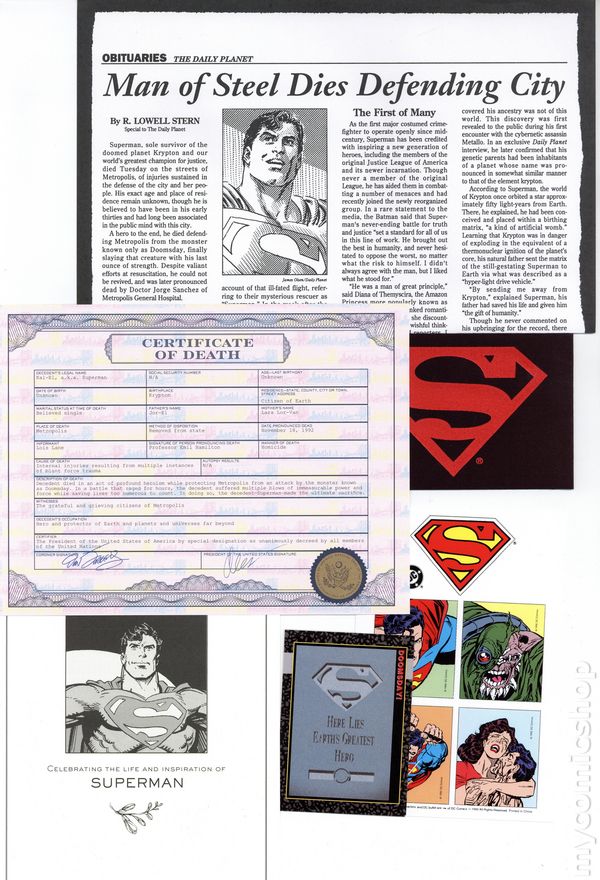 Book Market Edition - Bonus Material Includes: Newstime Magazine, Certificate of Death, Funeral Program, Black Death of Superman Armband, Poster, Obituary News Clipping, A sheet of 5 Stamps, and a Trading Card