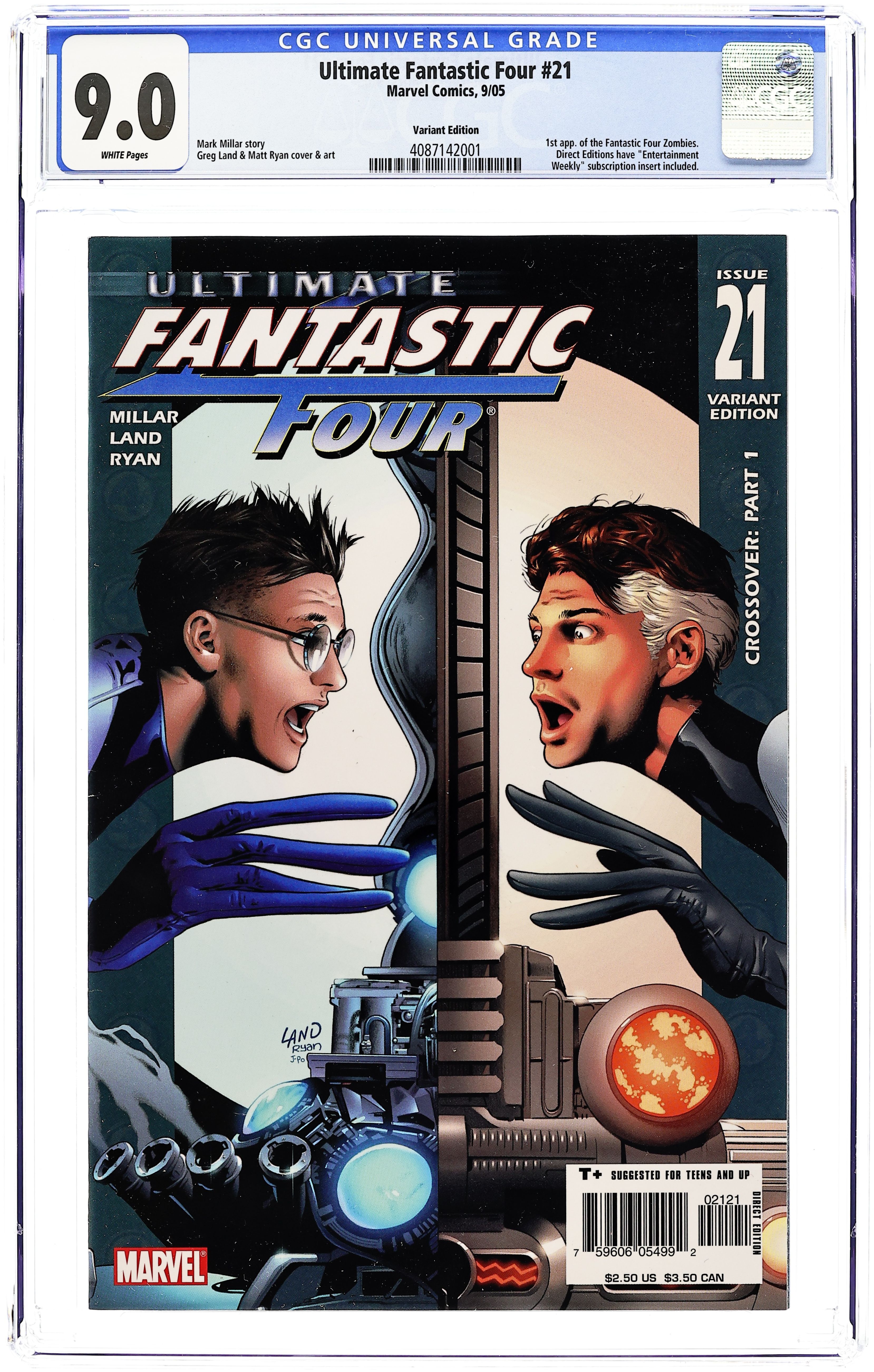 1st appearance of the Marvel Zombies - Written by MARK MILLAR Pencils & Cover by GREG LAND "CROSSOVER" Part 1 (of 3) Ultimate Starts Month begins here! Mark Millar returns to Ultimate Fantastic Four, and he's brought X-Men: Phoenix Endsong superstar Greg Land with him! Even in their short careers, the Ultimate FF have seen a lot of amazing things ? but nothing will prepare them for the world they're about to enter! Reed Richards has used his scientific genius to contact an Earth in a surprisingly familiar parallel dimension ? and he's ready to visit! 32 PGS./T+ SUGGESTED FOR TEENS AND UP ...$2.50 Cover price $2.50.