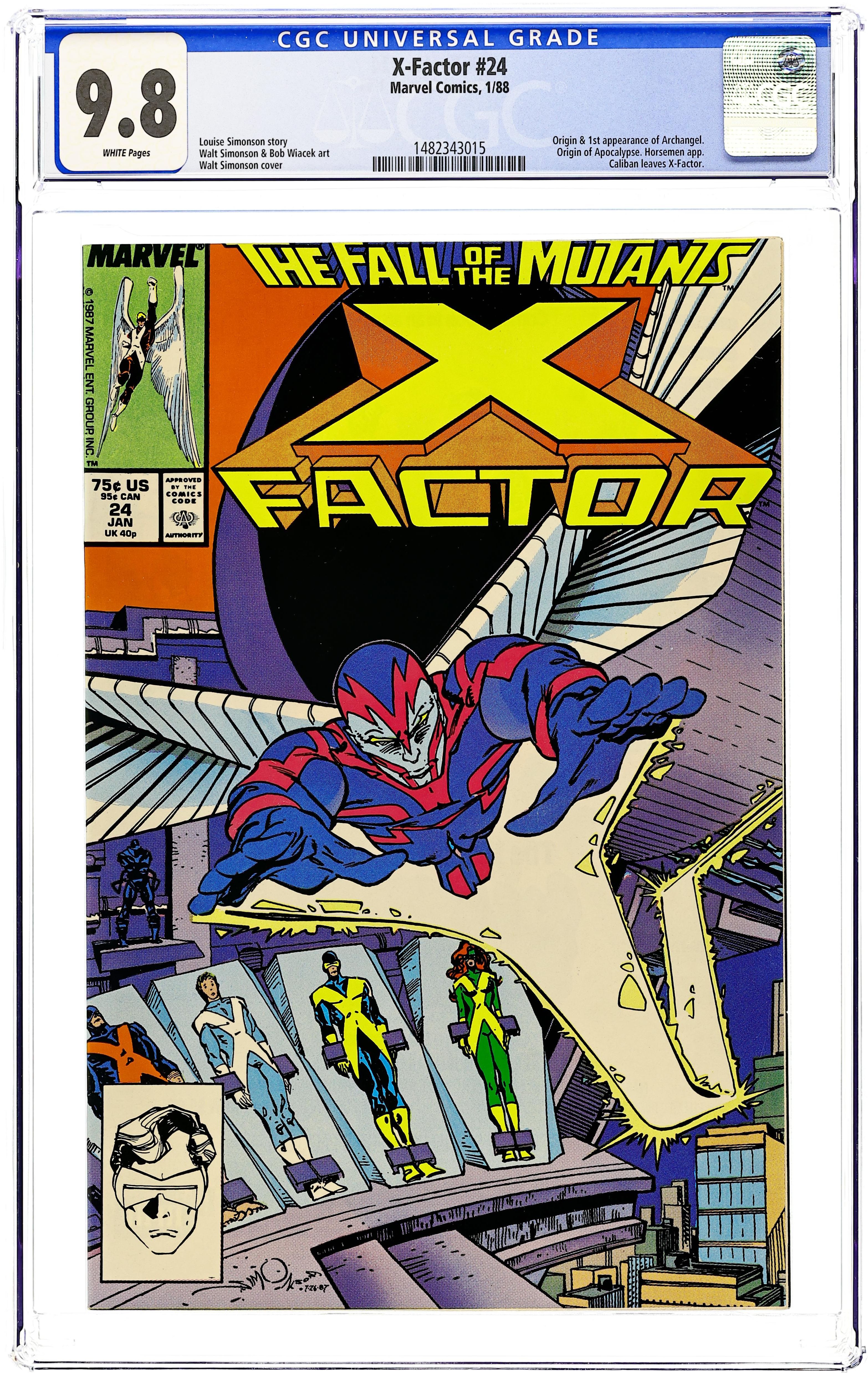 Direct Edition. Fall of the Mutants! Part 1 of 3. "Masks!" 1st full appearance of Archangel. Story by Louise Simonson. Art by Walter Simonson and Bob Wiacek. One of the biggest mutant events to ever hit the comic racks begins here. The powerful mutant known as Apocalypse finally makes his move and unleashes his Four Horseman on an unsuspecting world. The only thing standing between humanity and total annihilation is X-Factor. However when the fourth and final Horseman, Death, reveals his true identity, the group will be rocked to its very core. This is a pivotal chapter in the lives of the original X-Men. Cover price $0.75.