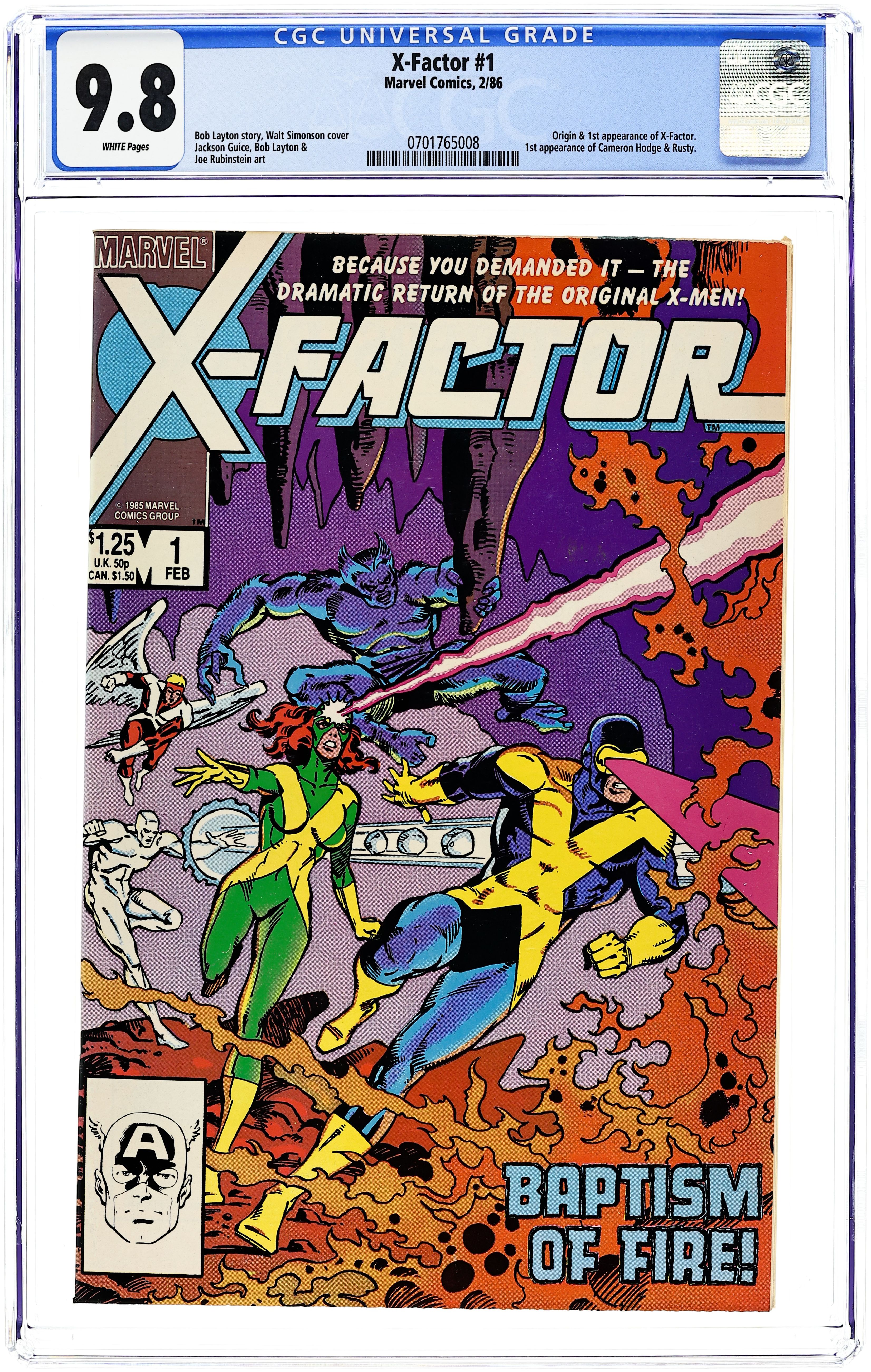 Direct Edition. Return of Jean Grey: Part 3 of 3 - "Third Genesis!" Mr. Fantastic cameo. Avengers flashback cameo. Story by Bob Layton. Art by Jackson Guice, Bob Layton, and Joe Rubinstein. Cover by Walt Simonson. Story continued from Avengers (1963-1996 1st Series) #263 and Fantastic Four (1961-1996 1st Series) #286. Charles Xavier is gone, whisked away to the far side of the universe by the Shi'Ar Empire (see Uncanny X-Men #200), but his dream is not dead. His original X-Men, Cyclops, Angel, Beast, Ice Man, and the recently resurrected Jean Grey, have reunited as the super-group called X-Factor to see his dream of mutants and humans co-existing in peace realized and brought to fruition. Cover price $1.25.