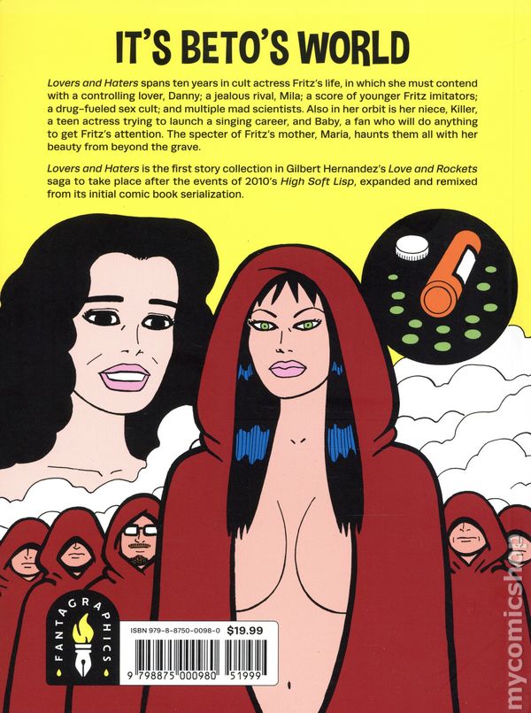 1st printing. Story and art by Gilbert Hernandez. The first story collection in Gilbert Hernandezs Palomar saga to take place after the events of 2010s High Soft Lisp is torn from the pages of Love and Rockets: New Stories, Love and Rockets Vol. IV, and Psychodrama Illustrated—and expanded with 14 new pages! In Lovers and Haters, 50-year-old cult movie actress Fritz, in addition to her alcoholism and the ups and downs of her career, must also contend with a controlling lover, Danny; a jealous rival, Mila; a score of younger Fritz imitators, a sex cult; and mad scientists. Also in her orbit is her niece, Killer (sometimes literally, as seen in a Doctor Who-inspired TV show), a teen actress trying to launch a singing career while solving math problems. The specter of Fritzs mother, Maria — also a cult movie actress — haunts them all with her beauty from beyond the grave. With a sprawling cast, Lovers and Haters is about mothers and daughters, aunts and nieces, complex and often toxic relationships, artists and exploiters, personas and obsessions. It reads like an X-rated The Substance mixed with Mommy Dearest and Performance, with an added dash of giallo. Softcover, 7 1/2-in. x 10-in., 120 pages, B&W. Mature Readers Cover price $19.99.
