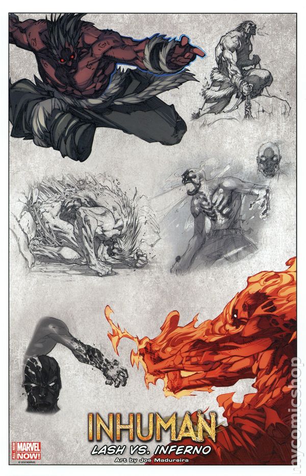 #4: Lash vs. Inferno - Art by Joe Madureira. This special art print celebrates the Marvel Now launch of the Inhuman, featuring Joe Madureira's sketch work featuring a showdown between newest Inhuman Inferno vs. Lash! Includes 1 print, 6 1/2-in. x 10-in., full color. All Ages