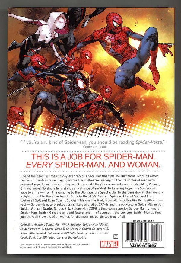 Starts Apr 27 1st printing. Collects Amazing Spider-Man (2014- 3rd Series) #7-15, Superior Spider-Man (2012-2014) #32-33, the Spider-Man story from Guardians of the Galaxy (2014 Marvel) Free Comic Book Day, Spider-Verse (2014) #1-2, Spider-Verse Team Up (2014) #1-3, Scarlet Spiders (2014) #1-3, Spider-Woman (2014 5th Series) #1-4, Spider-Man 2099 (2014 2nd Series) #5-8.