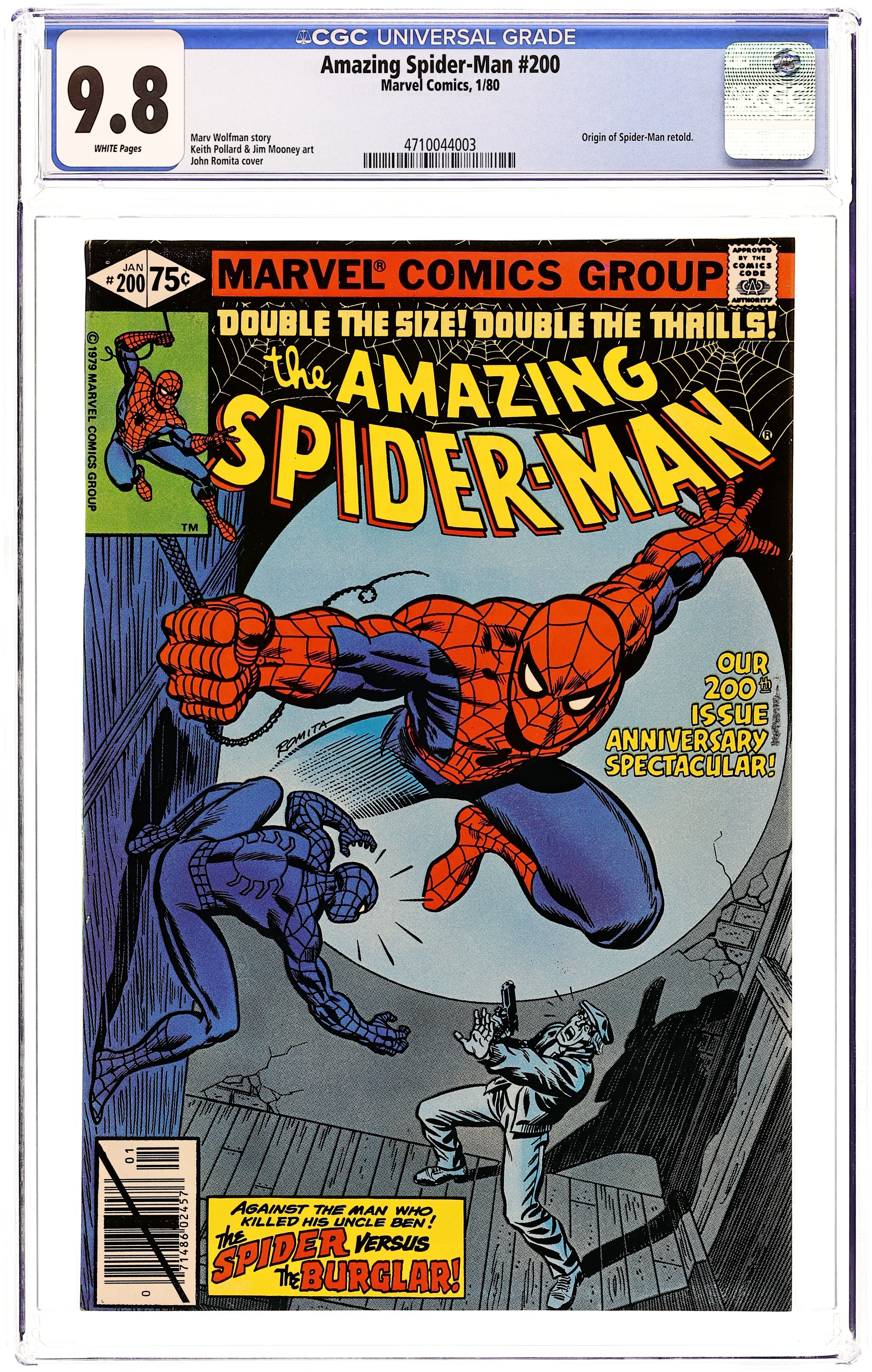 Direct Edition. "The Spider and the Burglar...A Sequel" Script by Marv Wolfman. Art by Keith Pollard (breakdowns) and Jim Mooney (finishes). Cover by John Romita. It's the bicentennial issue of the Amazing Spider-Man! And the web-slinger is going back, all the way back, to the days of Amazing Fantasy 15 to once again confront the criminal that murdered his Uncle Ben! But this time Peter Parker will have to stop the killer without his spider powers! Given a second chance, can the wall-crawler right the wrongs from the past and save his beloved Aunt May? Emotions run at an all-time high for your friendly neighborhood Spider-Man! Brief retelling of Spider-Man's origin. Cameo appearance by Anna Watson. Final appearance of the burglar. Flashback cameo by Ben Parker. (Note: Stan Lee scripts the final page of the story.)52 pgs. Cover price $0.75.