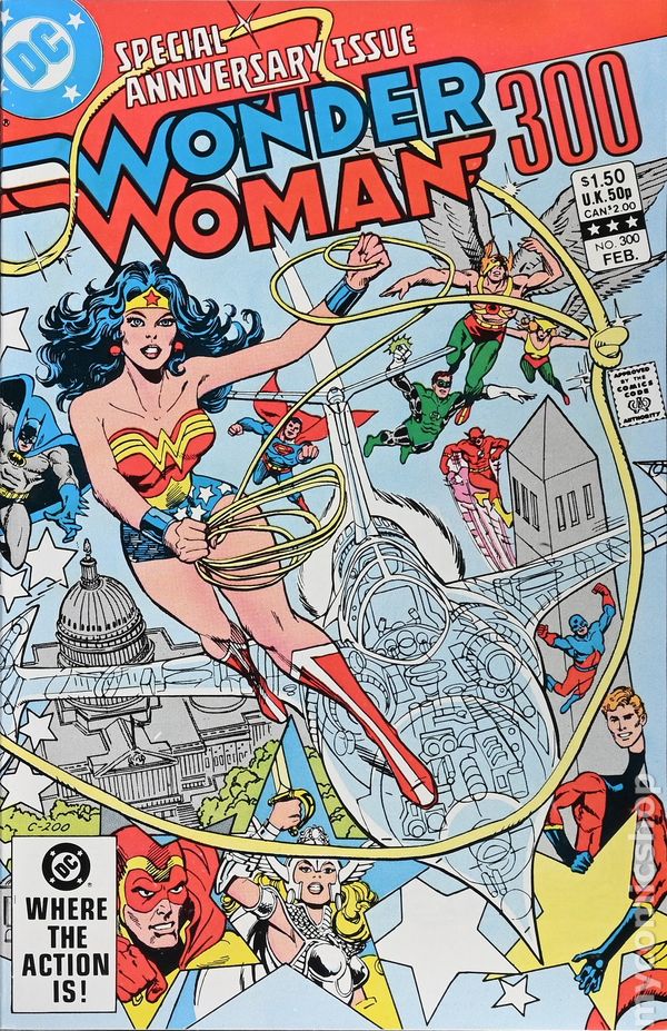 Direct Edition. 76-page giant. Wraparound cover pencils by Ed Hannigan, inks by Dick Giordano. "Beautiful Dreamer, Death Unto Thee!" (Chapter 1), script by Roy Thomas, Danette Thomas, and Dan Mishkin (consultant), pencils by Gene Colan, inks by Frank McLaughlin; Wonder Woman's life begins to unravel as her nightmares become increasingly real. "My Sister, My Self!" (Chapter 2), script by Roy Thomas, Danette Thomas, Dan Mishkin (consultant), pencils by Ross Andru, inks by Dick Giordano; Wonder Woman gets a glimpse of her own potential future happiness when she learns her Earth-Two counterpart is now a wife and mother. "The Sands of Doom!" (Chapter 3), script by Roy Thomas; Danette Thomas, and Dan Mishkin (consultant), pencils by Gene Colan, inks by Frank McLaughlin; Wonder Woman agrees to marry Steve Trevor, and then does away with the third wheel in their relationship - Diana Prince. "The Sands of Doom! Sandman Interlude," script by Roy Thomas, Danette Thomas, and Dan Mishkin (consultant), pencils by Keith Giffen, inks by Larry Mahlstedt. "The Queen Is Dead! Long Live the Queen!" (Chapter 4), script by Roy Thomas, Danette Thomas, and Dan Mishkin (consultant), pencils by Jan Duursema, inks by Tom Mandrake. Pin-ups by Michael Kaluta, George Perez, and Giffen. 76 pages, Full Color. Cover price $1.50.