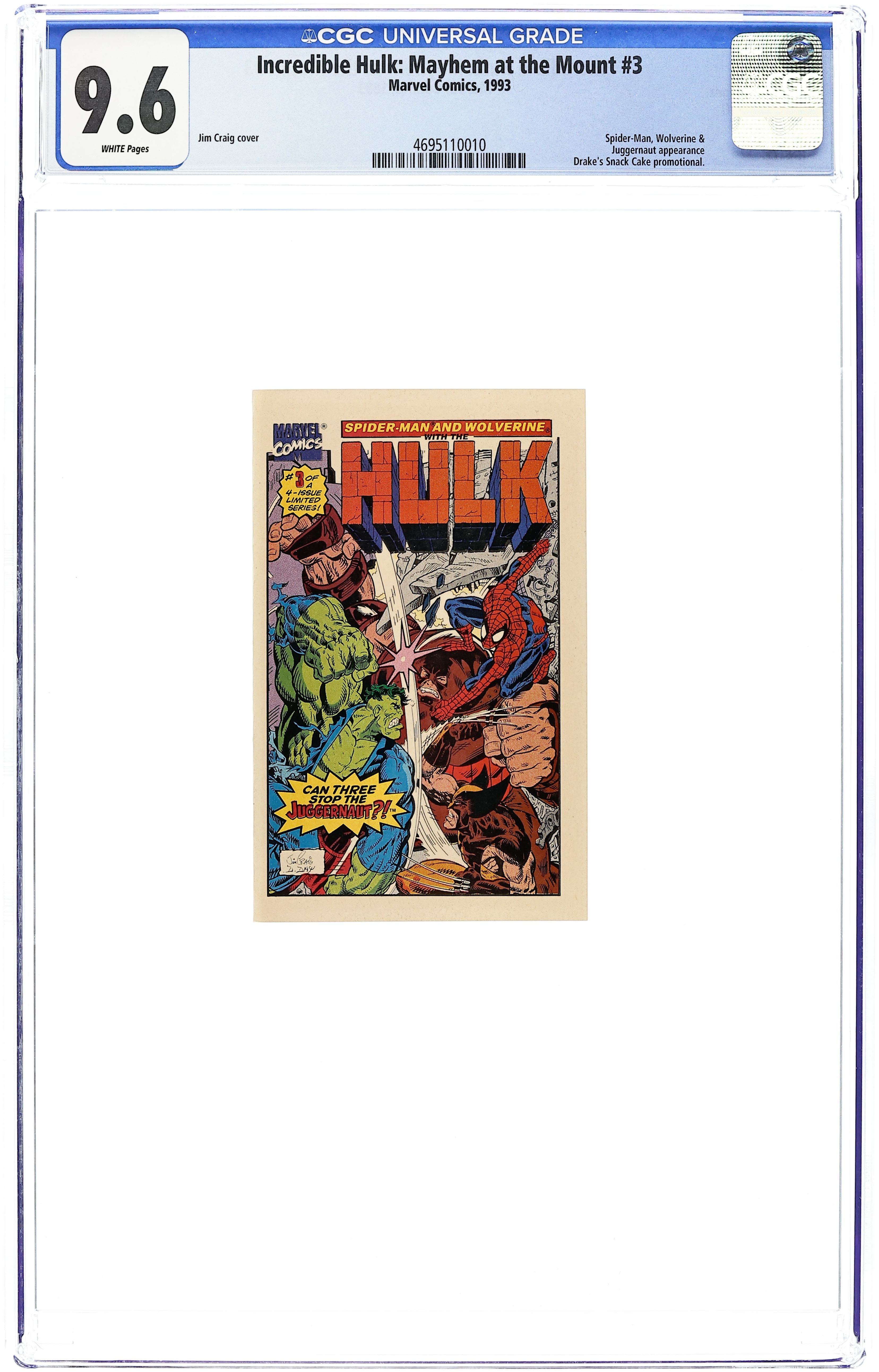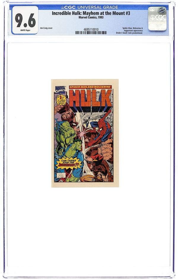 Indicia (Incredible Hulk: Mayhem at the Mount). # 3 of 4 issue limited series. Packaged and given away with Drake's snack cakes. Spider-Man, Wolverine and Hulk (1993) is a promotional comic book distributed by Drake's Snack Cakes. Written by Eric Fein. "Mayhem at the Mount" features a team-up with Spider-Man, Wolverine, and the Incredible Hulk. These three unlikely allies must set aside their differences long enough to work together and try to stop the the unstoppable Juggernaut. 16 pages, full color, 3-in. x 5-in., card stock, with no cover price. Jim Craig cover pencils. D. Day cover inks (no interior credits).