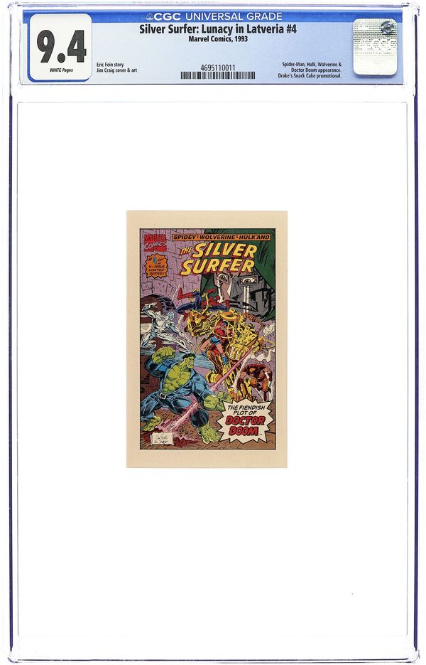 Indicia (The Silver Surfer: Lunacy in Latveria). # 4 of 4 issue limited series. Packaged and given away with Drake's snack cakes. Spider-Man, Wolverine, Hulk, and the Silver Surfer (1993) is a promotional comic book distributed by Drake's Snack Cakes. Script by Eric Fein, pencils by Jim Craig, inks by Dan and David Day. "Lunacy In Latveria" features a team-up with Spider-Man, Wolverine, the Incredible Hulk, and the Silver Surfer, the former herald of Galactus who is empowered with the Power-Cosmic. These unlikely allies must work together to stop the fiendish plot of the diabolical Doctor Doom. 16 pages, full color, 3-in. x 5-in., card stock, with no cover price.