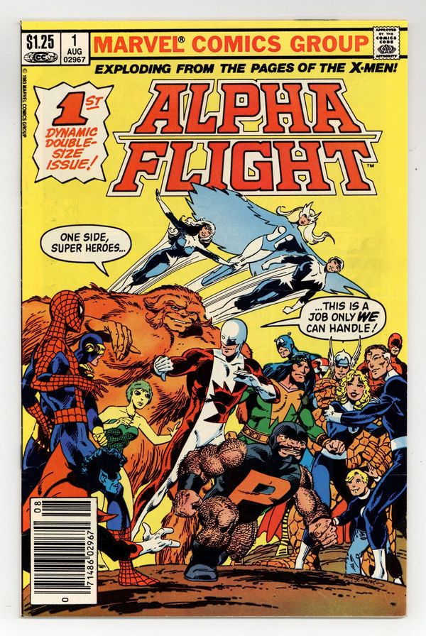 Starts May 4 Canadian edition with $1.25 cover price - "Tundra!" Story and art by John Byrne. Exploding from the pages of the X-Men comes Canada's premier super-team - Alpha Flight! The monstrous Sasquatch, the mystical Shaman, the twins, Aurora and Northstar, the divine Snowbird, the tumbling Puck (1st appearance), the aquatic beauty, Marrina (1st appearance), and their leader, Vindicator, must reunite to stop the destructive elemental force known as Tundra. NOTE: Also 1st appearance of Omega Flight (Diamond Lil, Wild Child, Flashback,& Smart Alec). Cover price $1.25.