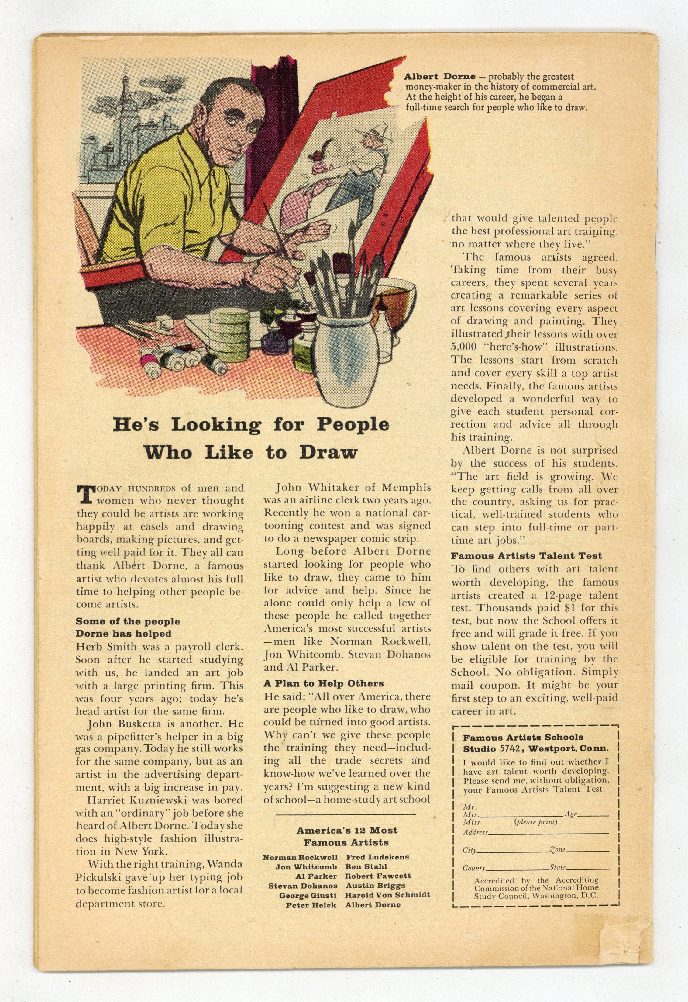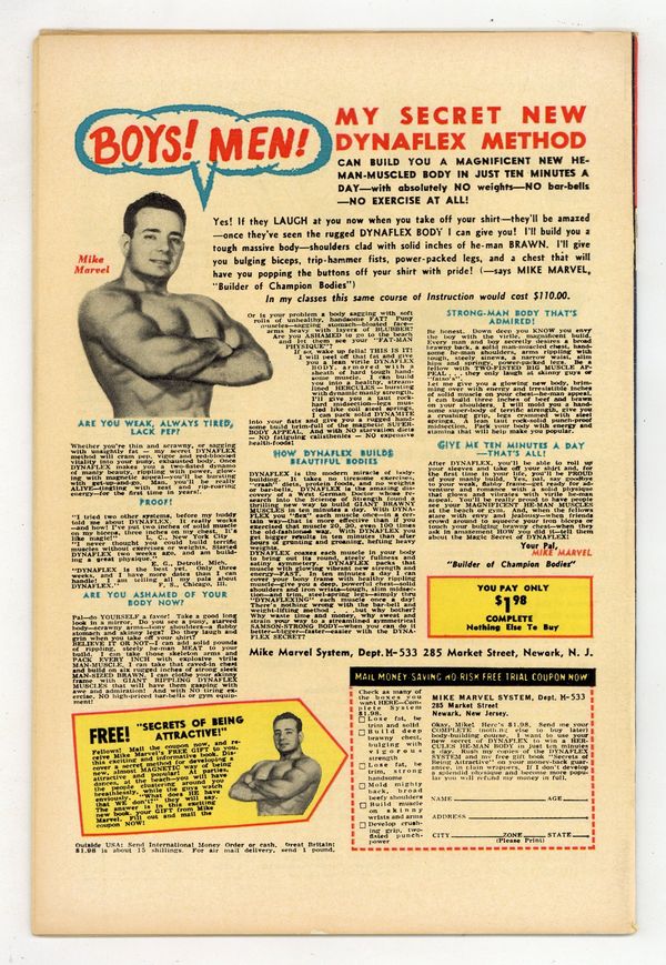 Starts Feb 16 Cover by Jack Kirby and George Roussos. Showdown With the Human Top!, script by Stan Lee, art by Jack Kirby and Dick Ayers; Human Top steals civil defense plans and wants to sell them to the Communists. The Sorcerer text story, art by Joe Maneely; A man who has travelled the world and seen wonders performed by hermits in India returns home to find that his young nephew creates magic with only belief. No Place to Turn!, script by Stan Lee and Larry Lieber, art by Larry Lieber and Matt Fox; Aliens transform a spy into a human, but because they can only receive black-and-white images from Earth they leave him green and he is discovered. Somewhere Waits a Wobbow!, script by Stan Lee and Larry Lieber, art by Larry Lieber and George Roussos [as G. Bell]; The Wasp tells the tale of future mercenary pilot Rack Morgan who disobeys the rules once too many. 36 pgs., full color. $0.12. Cover price $0.12.
