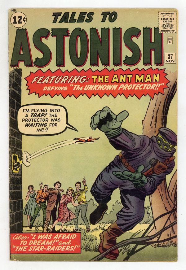 Starts Feb 9 Cover by Jack Kirby and Dick Ayers. Trapped by the Protector! Part 1, script by Stan Lee and Larry Lieber, art by Jack Kirby and Dick Ayers; Ant-Man deals with a dangerous extortionist, who turns out to be disguised as one of the victimized jewelers. [Trapped by the Protector!, Part 2:] Face-to-Face With the Protector!, script by Stan Lee and Larry Lieber, art by Jack Kirby and Dick Ayers. The Magician text story. Afraid to Dream!, art by Don Heck; A man whose dreams come true is terrified when he dreams his own death. The Star Raiders, script by Stan Lee, art by Steve Ditko; A group of escaped convicts turned pirates are tricked into attacking a planet they believe defenseless by a man who claims the inhabitants are midgets neglecting to mention that they are only midgets compared to him. 36 pgs., full color. $0.12. Cover price $0.12.