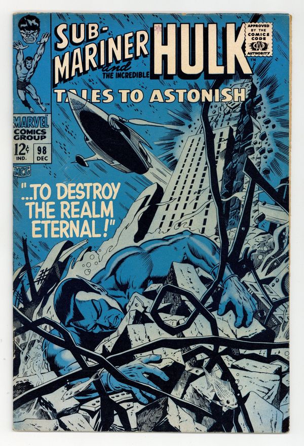 Starts Feb 16 Cover by Gil Kane. Outside the Gates Waits..Death!, script by Stan Lee, art by Bill Everett and Dan Adkins; As the new ruler of Atlantis, Byrrah has Namor arrested and sent to the dreaded Inferno Isle; Namor battles the lava monster that lives there and returns to Atlantis to seek his vengeance; Meanwhile, back in the undersea kingdom, Dorma has found Byrrah's hypnosis machine that won him the throne and uses it to turn the Atlantean allegiance back to Namor. Whosoever Harms the Hulk..!, script by Stan Lee, art by Gil Kane; Ross and his men try to revive the Hulk after his beating by the Abomnation; Returning from the brink of death, Hulk is about to leave when the pleading Rick Jones causes him to transform back to Banner; Banner uses his knowledge to lure Abomination back to Gamma base with Betty in tow; Hulk and Abomination clash once again; Watching from a distant galaxy, the Stranger realizes that the Abomination is a much better ally than the Hulk and zaps him to his side, ending the battle. 36 pgs., full color. $0.12. Cover price $0.12.