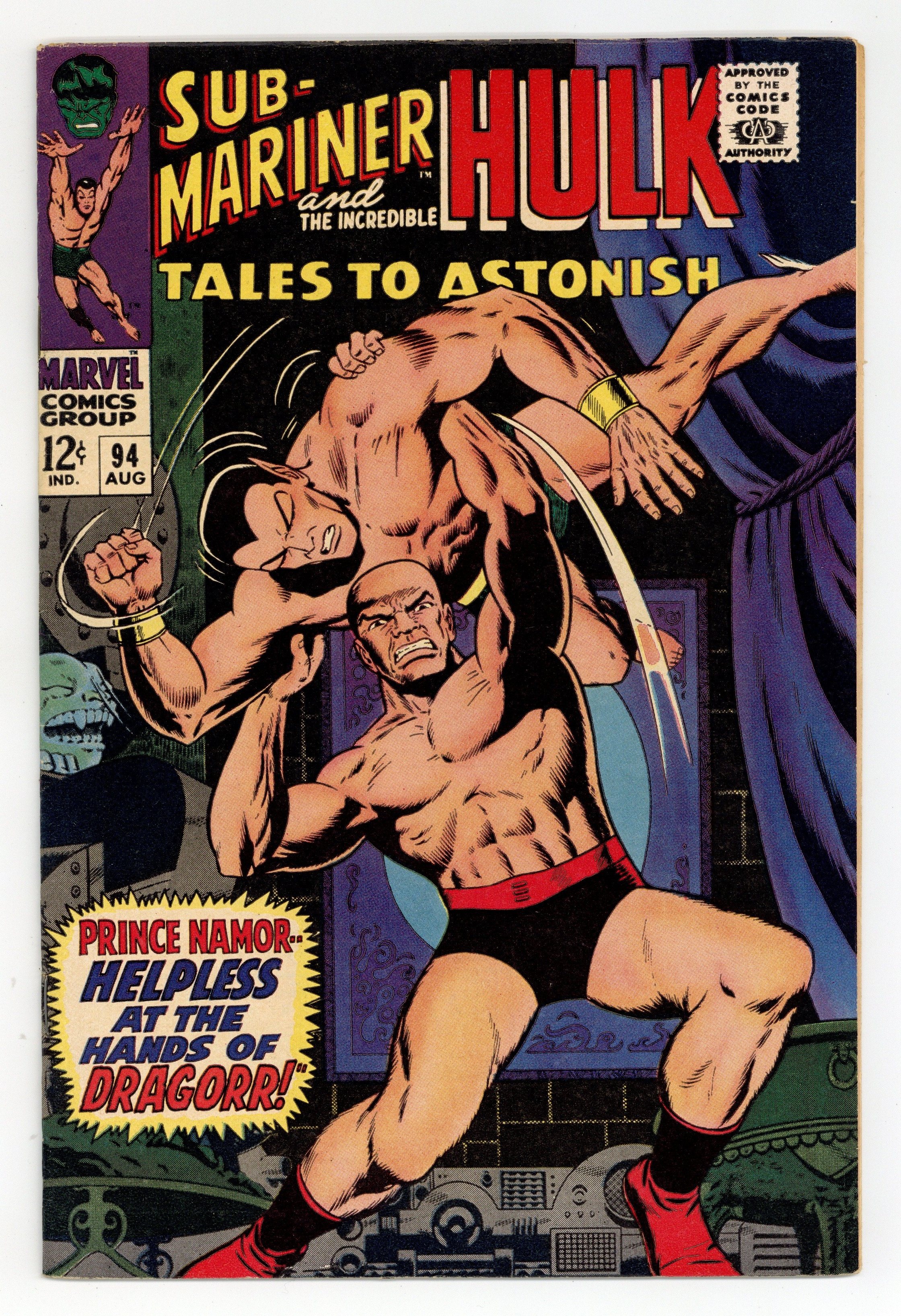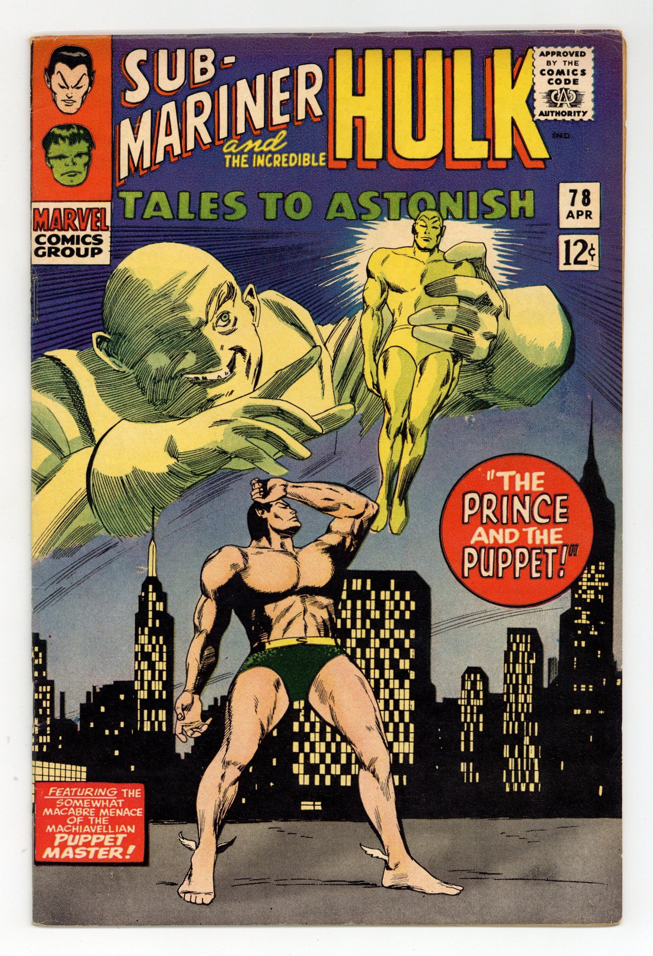 Starts Feb 9 Cover by Gene Colan and Vince Colletta. The Prince and the Puppet!, script by Stan Lee, art by Gene Colan (as Adam Austin), and Vince Colletta; Namor is confronting Hank and Jan about a drilling operation that is causing earthquakes in Atlantis when he comes under the control of the Puppet Master; The villain commands him to come to New York and rob the nearest bank to replenish his dwindling coffers; Namor brings back a stack of non-negotiable treasury bonds and an angry Puppet Master sends him back for the cash. The Hulk Must Die!, script by Stan Lee, art by Jack Kirby and Bill Everett; The Hulk returns from the future and is promptly captured by the military; Rick spills the secret to Betty that Bruce and the Hulk are one and the same and she tries to come to grips with that fact; Banner's replacement at gamma base, Dr. Zaxon, plans to use the power of the Hulk to fuel his own bid for world conquest. 36 pgs., full color. $0.12. Cover price $0.12.