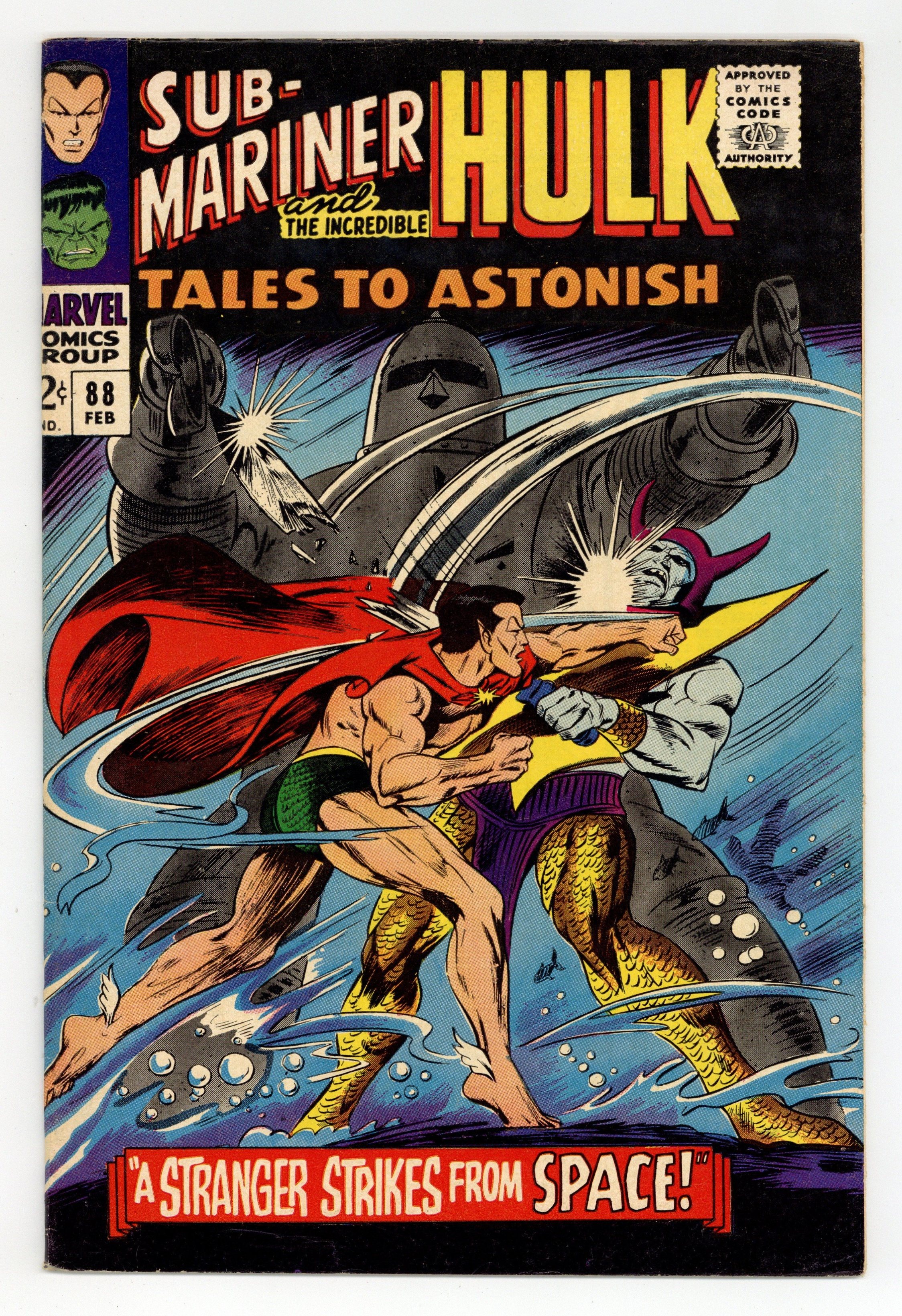 Starts Feb 9 Cover by Gene Colan and Bill Everett. A Stranger Strikes from Space!, script by Stan Lee, art by Bill Everett; A giant alien robot accidentally falls out of a passing spaceship and into the lap of Attuma in depths of the ocean; He decides to use this turn of good fortune to destroy Namor and Atlantis. Boomerang and the Brute!, script by Stan Lee, art by Gil Kane; Since they have discovered that the Hulk is not the total villain he has been painted to be, the president tells Ross to pardon him if he thinks the threat is over; Of course, Boomerang picks that exact moment to secretly enrage the jade giant, causing him to go on another rampage and causing Ross to still see him as a menace; Hulk fights the new and improved (but still fashion-impaired) Boomerang. 36 pgs., full color. $0.12. Cover price $0.12.
