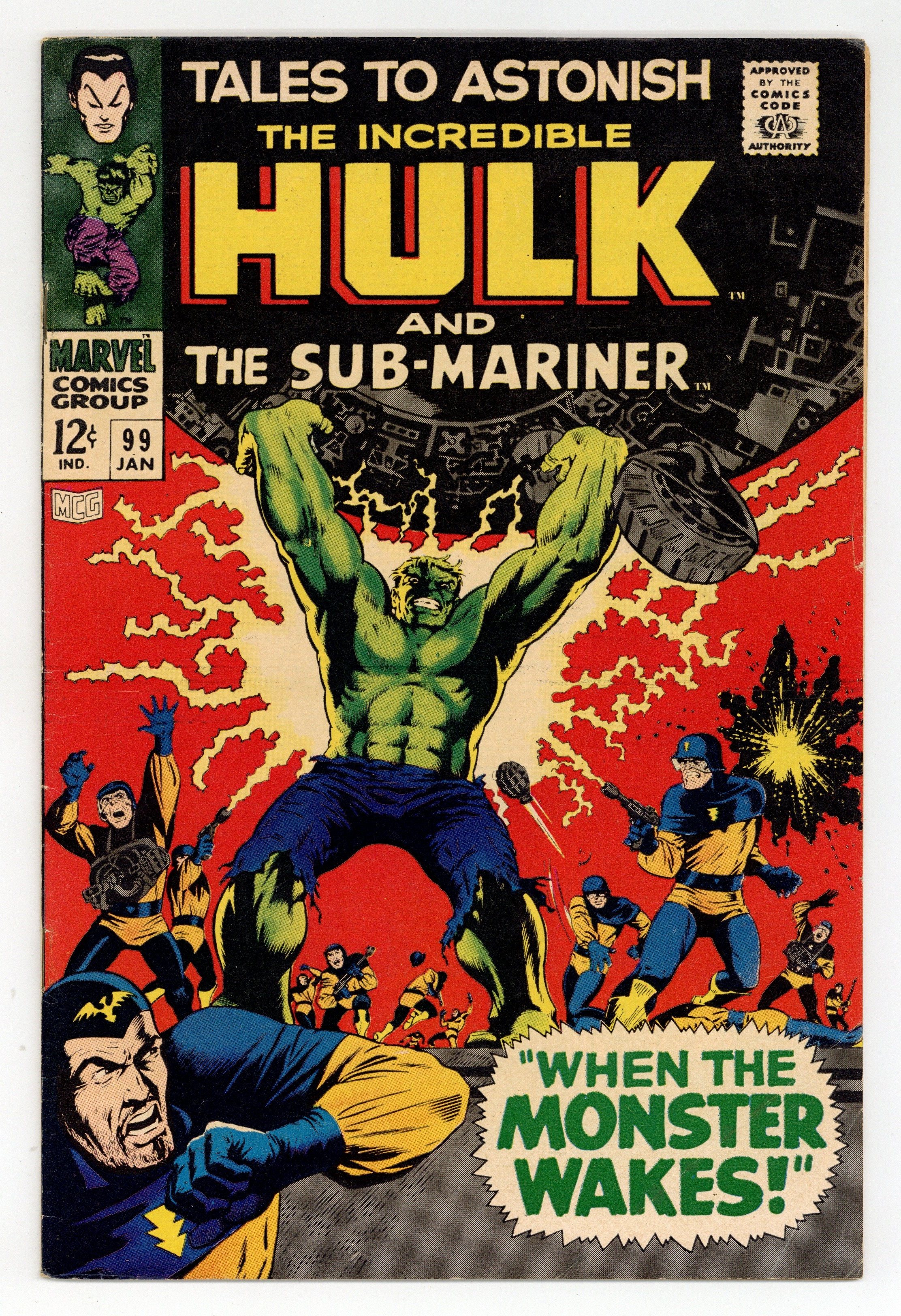 Starts Feb 9 Cover by Marie Severin and Dan Adkins. When the Monster Wakes!, script by Stan Lee, art by Marie Severin and John Tartaglione; With the military base under control of the Lord of the Living Lightning and the threat of a deadly missile barrage looming, it is up to the Hulk and Talbot to retake the instillation and beat back the Living Lightning troops; The Hulk succeeds in stopping his foe but has to blow up the military base to do it. When Falls the Holocaust!, script by Archie Goodwin, art by Dan Adkins; Namor awakens in the ruins of Atlantis only to find that his army has taken off to start a war with the surface world; They plan on activating their latest and most dangerous weapon, the Hurricane Inducer, but the machine has not been tested and Namor fears that it will cause great harm to friend and foe alike; With his subjects already thinking him a traitor for allying with the piratical Plunderer, Namor doesn't do his tarnished rep any favors when he is caught destroying the Atlantean's most powerful weapon. 36 pgs., full color. $0.12. Cover price $0.12.