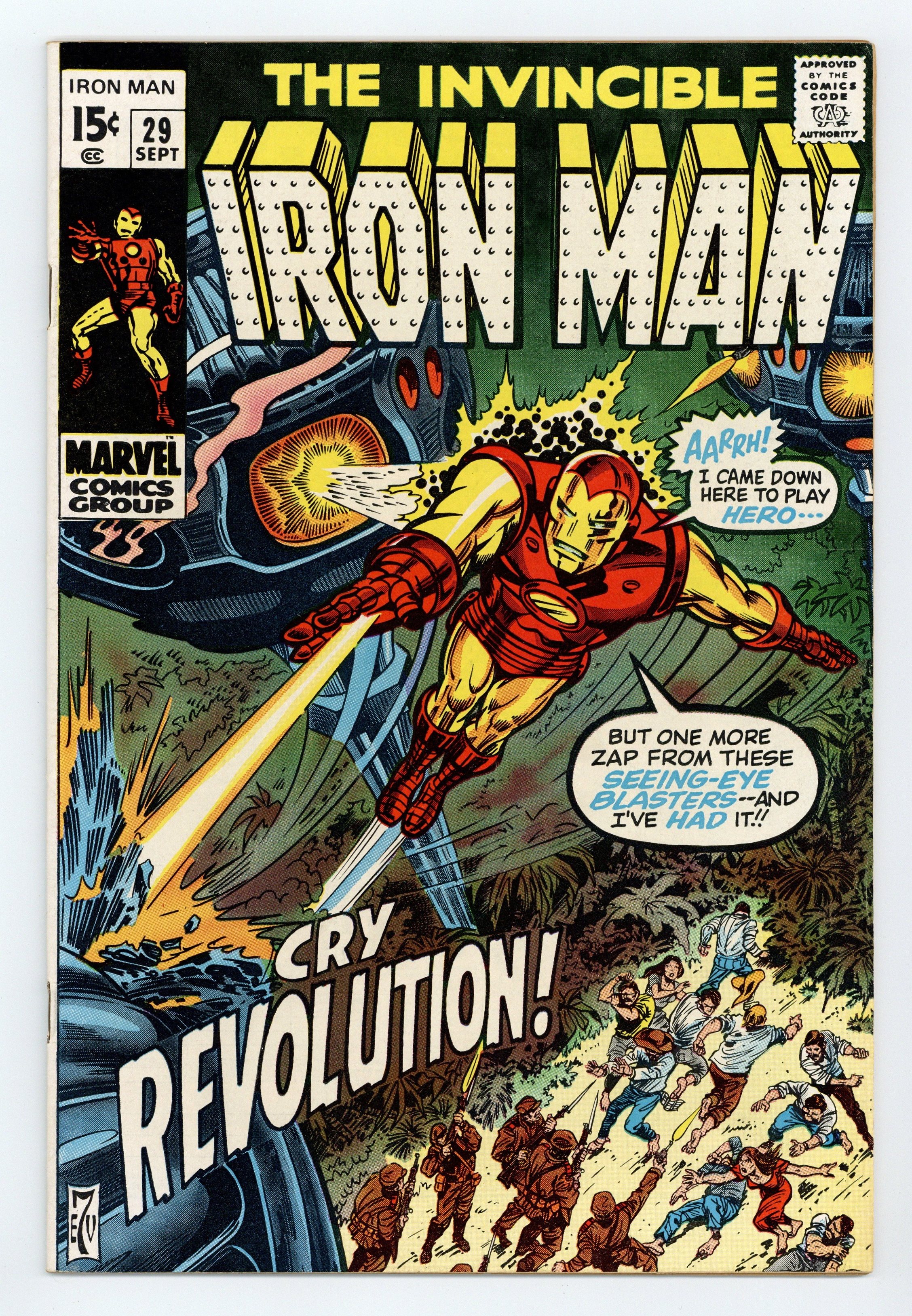 Starts Apr 27 "Beneath the Armor Beats a Heart!" Story by Gary Friedrich. Art by George Tuska and Vince Colletta. Cover by Gil Kane. During Iron Man's triumphant battle over the Night Phantom, Marianne Rodgers reveals to Shell-head that she knows he is Tony Stark. Later that evening Tony proposes to Marianne, and she accepts. Meanwhile, Kevin O'Brien is growing increasingly jealous of Tony's relationship with Marianne, and that leads to the first battle between Iron Man and the Guardsman! Also in this issue, Simon Gilbert wants the Stark Industries board of directors to remove Tony as company president. 32 pages Cover price $0.20.