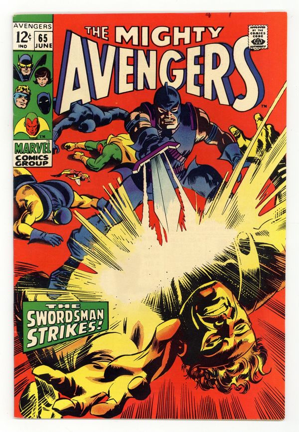 Starts Feb 16 Last 12-cent issue. "Mightier than the Sword?" Part 3 of 3. Script by Roy Thomas. Pencils by Gene Colan. Inks by Sam Grainger. Cover by Gene Colan and Sam Grainger (with alterations by John Romita and Frank Giacoia). After the tragic death of his brother last issue, Clint Barton vows revenge against Egghead! And auspiciously for the new Goliath, his firstopportunity comes very soon! Upon returning to Earth, Egghead dispatches the Swordsman to Avengers Mansion to capture his old foe Henry Pym! But neither super-villain knows that Hank has recently changed his identity to Yellowjacket! Amid the confusing battle, the Swordsman grabs Clint instead and takes him back to Egghead! And for the vengeance-seeking avenger... that's right where he wants to be...for payback! Partial origin of Hawkeye (aka Clint Barton). Flashback cameos by Barney Barton and the Swordsman. Avengers Lineup: Black Panther, Goliath, Vision, Wasp, and Yellowjacket. (Notes: The Swordsman previously appeared in Captain America 105. Egghead returns in Marvel Feature (1st series) 5. This three-part story was reprinted in Marvel Super Action 24-26.) 36 pages. Cover price $0.12.