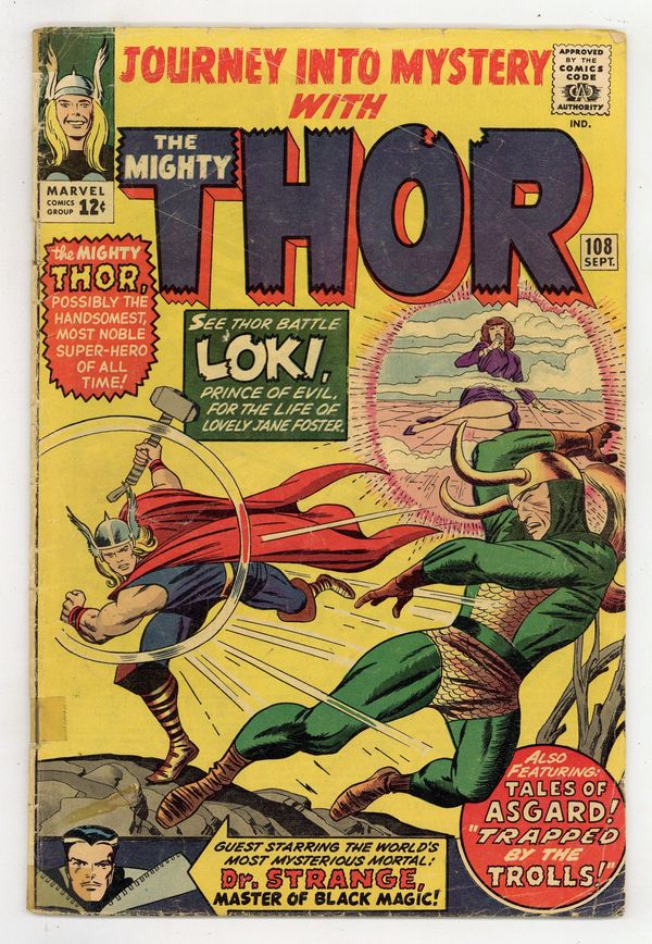 Ends Feb 16 9:44 PM CST Bid History 2 bids Current Bid $6 Your Secret Max Bid If you'd like to bid, please log in or register. Cover pencils by Jack Kirby, inks by Sol Brodsky. Doctor Strange and the Avengers (Iron Man, Giant-Man, and the Wasp) crossover in "At the Mercy of Loki, Prince of Evil!", script by Stan Lee, pencils by Jack Kirby, inks by Chic Stone; Thor is called to the aid of Doctor Strange, and as Dr. Blake saves his life after a crippling mystic attack; Loki takes advantage of a misunderstanding between Thor and Odin to come to Earth and kidnap Jane Foster; Thor finds Loki and defeats him, while a grateful Doctor Strange saves Jane; Heimdall cameo. "Tales of Asgard" back-up: "Trapped by the Trolls!", script by Stan Lee, pencils by Jack Kirby, inks by Vince Colletta; The king of the dwarfs attempts to sell an incognito Thor to the trolls as a slave, and Thor frees all of their captives and destroys their mine. The second half of a two-page text story, "Traveling Sam." 36 pgs., full color. Cover price $0.12.