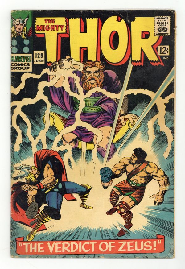 Ends Feb 16 9:44 PM CST Bid History 6 bids Current Bid $51 Your Secret Max Bid If you'd like to bid, please log in or register. Title becomes Thor; previously Journey Into Mystery. Cover pencils by Jack Kirby, inks by Vince Colletta. "Whom the Gods Would Destroy!", script by Stan Lee, pencils by Jack Kirby, inks by Vince Colletta; Thor and Hercules fight over Jane Foster; Odin, still angry because Thor revealed his identity to Jane, removes half Thor's powers by giving 'Odin Power' to Seidring. Hercules defeats Thor. Marvel Bullpen Bulletins. Tale of Asgard: "The Summons!", script by Stan Lee, pencils by Jack Kirby, inks by Vince Colletta; The Argonauts are called home to Asgard by Odin. Appearances by Balder, Hogun, Fandral, Volstagg, and Odin. The letters page contains a statement of ownership, management and circulation: average print run 377,663; average paid circulation 232,644. 36 pgs., full color. $0.12. Cover price $0.12.