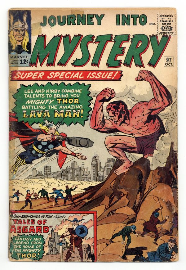 Starts Feb 16 Cover pencils by Jack Kirby, inks by George Roussos. First appearance of the Lava Man in "The Mighty Thor Battles the Lava Man!", script by Stan Lee, pencils by Jack Kirby, inks by Don Heck; Thor battles the Lava Man, a monster brought to the surface by Loki, who claims all the dry surface of Earth for his people; Odin forbids Thor to love Jane Foster, leading to her leaving her job as Dr. Blake's nurse. "The Traveler" text story. "The Perfect Defense!", script by Stan Lee (plot) and Larry Lieber (script), pencils by Larry Lieber, inks by George Roussos (as George Bell); In the future, Earth has conquered all planets except one, which no expedition returns from; The military thinks they have some horrific defense, but in fact they are simply so kind to the humans that arrive to conquer that they don't want to leave. "Tales of... ...Asgard! Home of the Mighty Norse Gods," script by Stan Lee, pencils by Jack Kirby, inks by George Roussos (as G. Bell); Beneath Asgard lies the Well of Life. From it came Ymir, greatest of the Frost Giants and Buri, the first Norse God who gave life to Borr. Borr had three sons. Odin was one of them. 36 pgs., full color. Cover price $0.12.