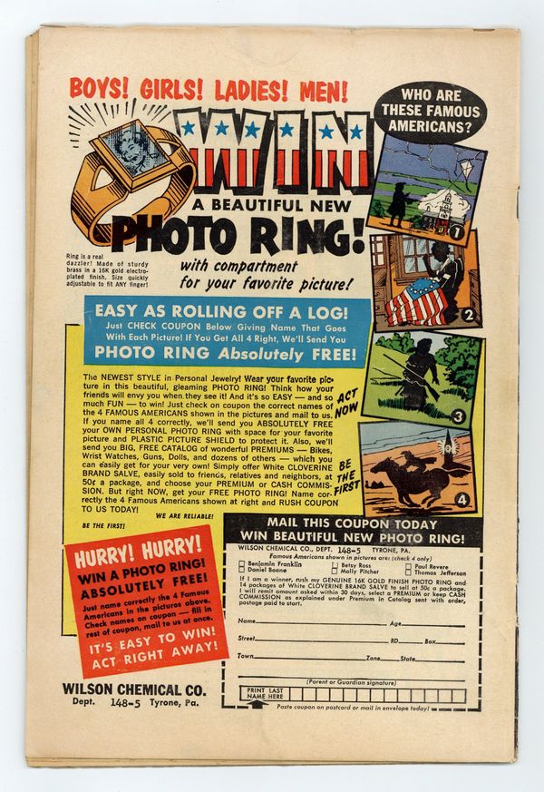 Ends Feb 16 8:40 PM CST Bid History 6 bids Current Bid $36 Your Secret Max Bid If you'd like to bid, please log in or register. Cover pencils by Jack Kirby, inks by Christopher Rule. "I Unleashed Monstro on the World!," art by Steve Ditko; A hypnotist brings a giant albino gorilla to America, but causes a near calamity when he finds that the beast is blind, and so immune to hypnosis. "Music Master' text story. "I Dared to Defy...the Idol's Curse!," art by Joe Sinnott; A mercenary tries to steal a sacred diamond from a mysterious idol, only to find that the idol is actually a trap set by aliens to collect a human sample for study. "My Other Face!," pencils by Al Williamson, inks by Al Williamson and Roy Krenkel; A space pilot in the year 2010 is convinced that his appearance is holding him back, and seeks out a new Martian beauty serum, which he is horrified to find turns him into a handsome Martian. "I Know the Gargoyle's Secret!," script by Carl Wessler, art by John Severin; A Frenchman fascinated with gargoyles joins the resistance in WWII. "I Am the Menace from the Purple Planet!," pencils by Jack Kirby, inks by Christopher Rule. 36 pages, full color. Cover price $0.10.