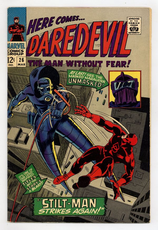 Starts Mar 23 Cover pencils by Gene Colan, inks by Frank Giacoia. Stilt-Man Strikes Again, script by Stan Lee, art by Gene Colan; Matt continues in his role as Mike Murdock, Daredevil supreme; The Leap-Frog hops away from his trial and when DD goes after him, he runs across Stilt-Man; The Masked Marauder searches for DD's secret identity and rescues Stilt-Man from Hornhead. 32 pgs. Cover price $0.12. Cover price $0.12.
