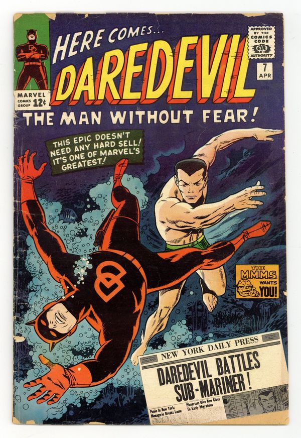 Starts Apr 20 "In Mortal Combat with Sub-Mariner!" Written by Stan Lee. Art and cover by Wally Wood. Namor hires Franklin and Murdock to sue the human race on his behalf. When this doesn't work, he gets himself arrested so he can have his day in court. Realizing humanity won't listen, the Sub-Mariner goes on a rampage which brings Daredevil into the (hopeless) fray. Namor returns to the sea out of respect for DD and to stop Krang from taking over Atlantis. Sub-Mariner/Daredevil pin-up by Wood. Note: First appearance of Daredevil's red costume. 36 pages, full color. Cover price $0.12.