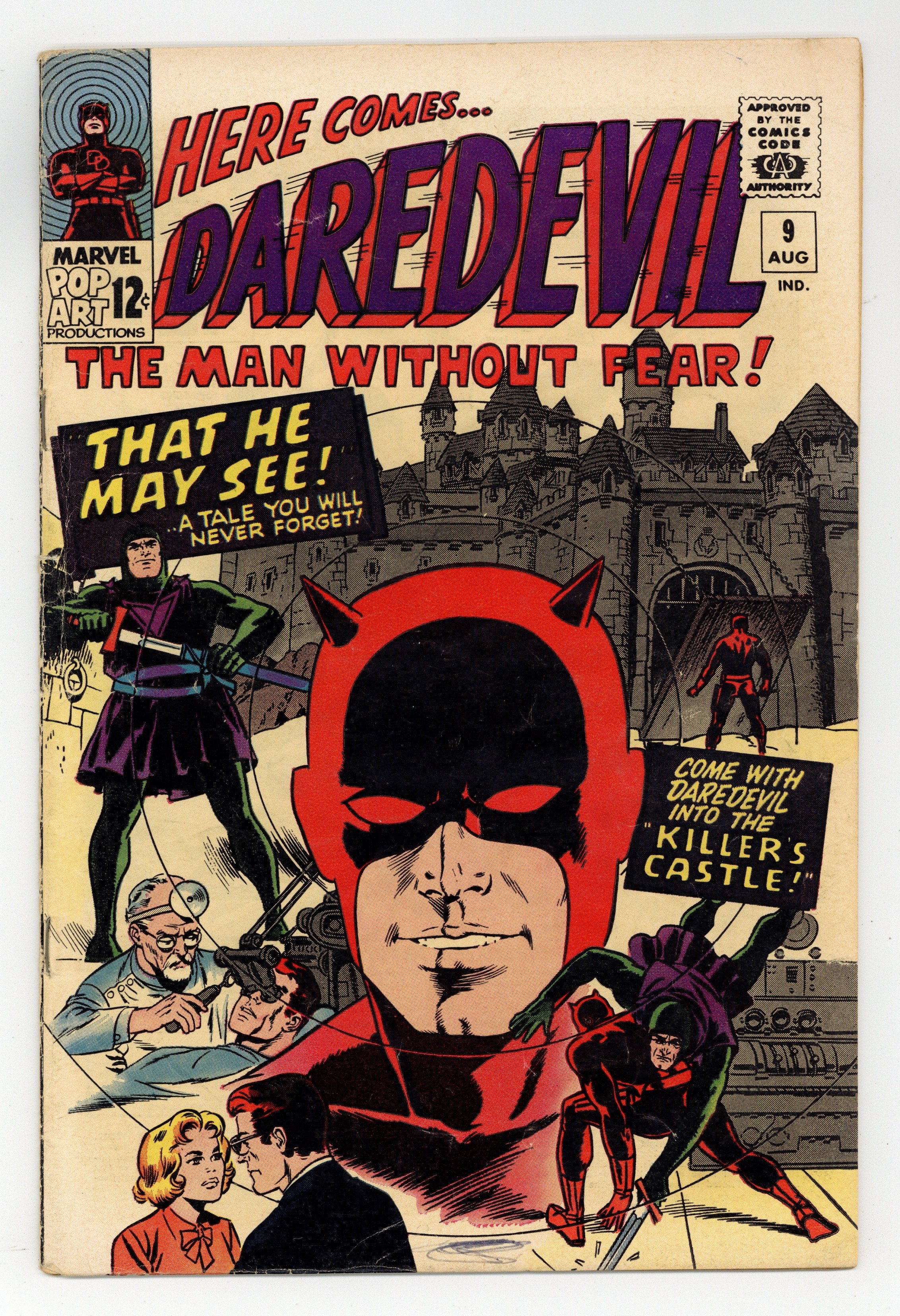 Starts Mar 23 Cover pencils by John Romita, inks by Frank Giacoia. Spider-Man guest stars in None Are So Blind!, script by Stan Lee, pencils by John Romita Sr., inks by Frank Giacoia (as "Frank Ray"); Spidey, thinking he has discovered Daredevil's secret, accuses Foggy of being DD; Foggy kind of plays along to impress Karen; DD and Spidey stop fighting long enough to take down the Masked Marauder. 36 pgs. Cover price $0.12. Cover price $0.12.