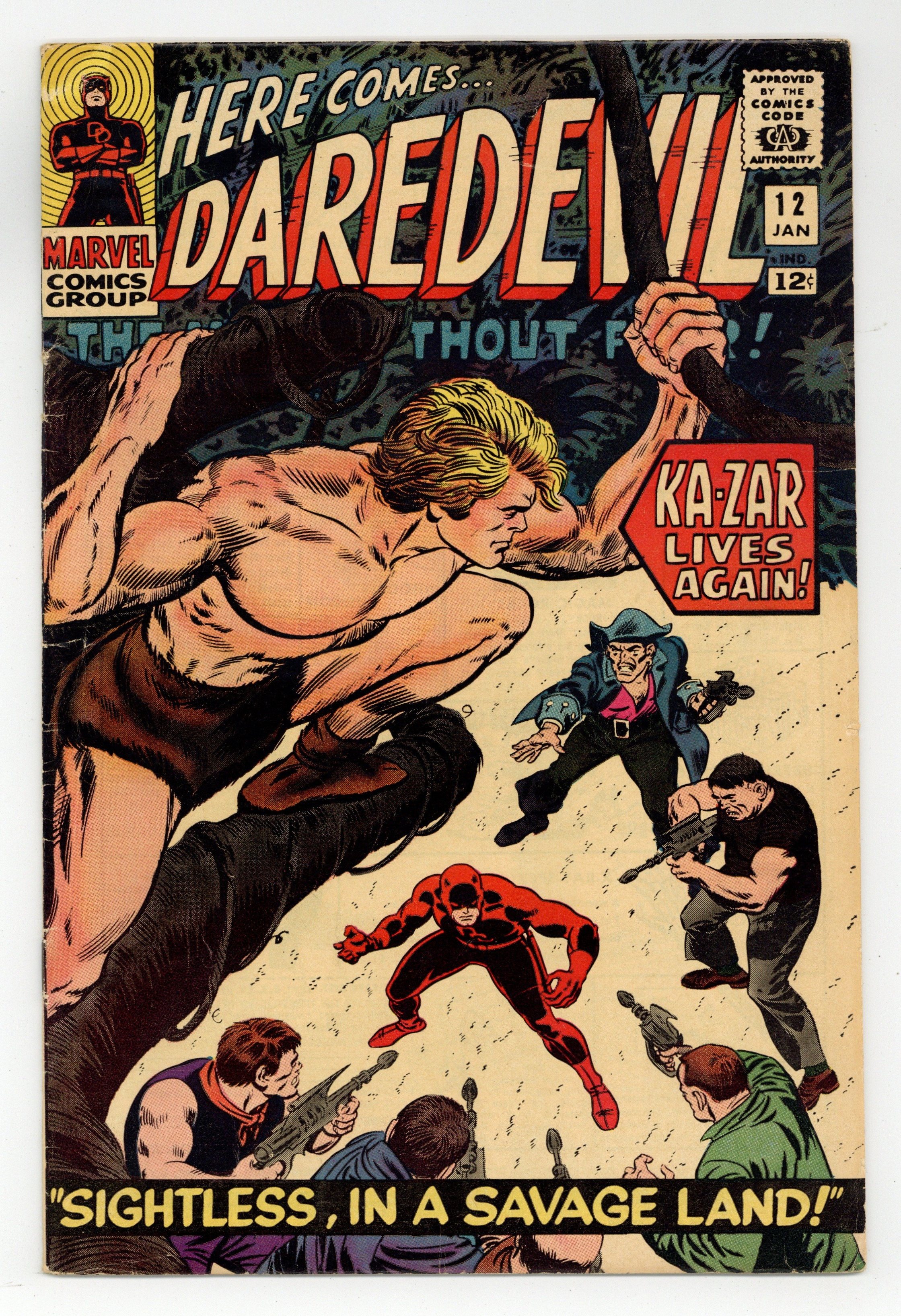 Starts Mar 23 "Sightless, in a Savage Land!" Written by Stan Lee. Pencils byJack Kirby. Inks by John Romita Sr (1st comic work) Cover pencils by John Romita and Jack Kirby (Ka-Zar figure), inks by Vince Colletta and John Romita (retouches). Guest-starring Ka-Zar. Matt decides to take a cruise to get his mind off of Karen. After his cruise ship is boarded by pirates, DD is taken to the Savage Land by the Plunderer. Ka-Zar attacks the Plunderer for trespassing on his domain and saves Daredevil's life as his costume reminds the savage lord of his encounter with the X-Men. Cameos by the Sub-Mariner, the Organizer, Mr. Fear, Ape Man, Bird Man, Cat Man, Frog Man, Stilt-Man, the Matador, and the Owl. Note: First appearance of the Plunderer. Cover price $0.12.