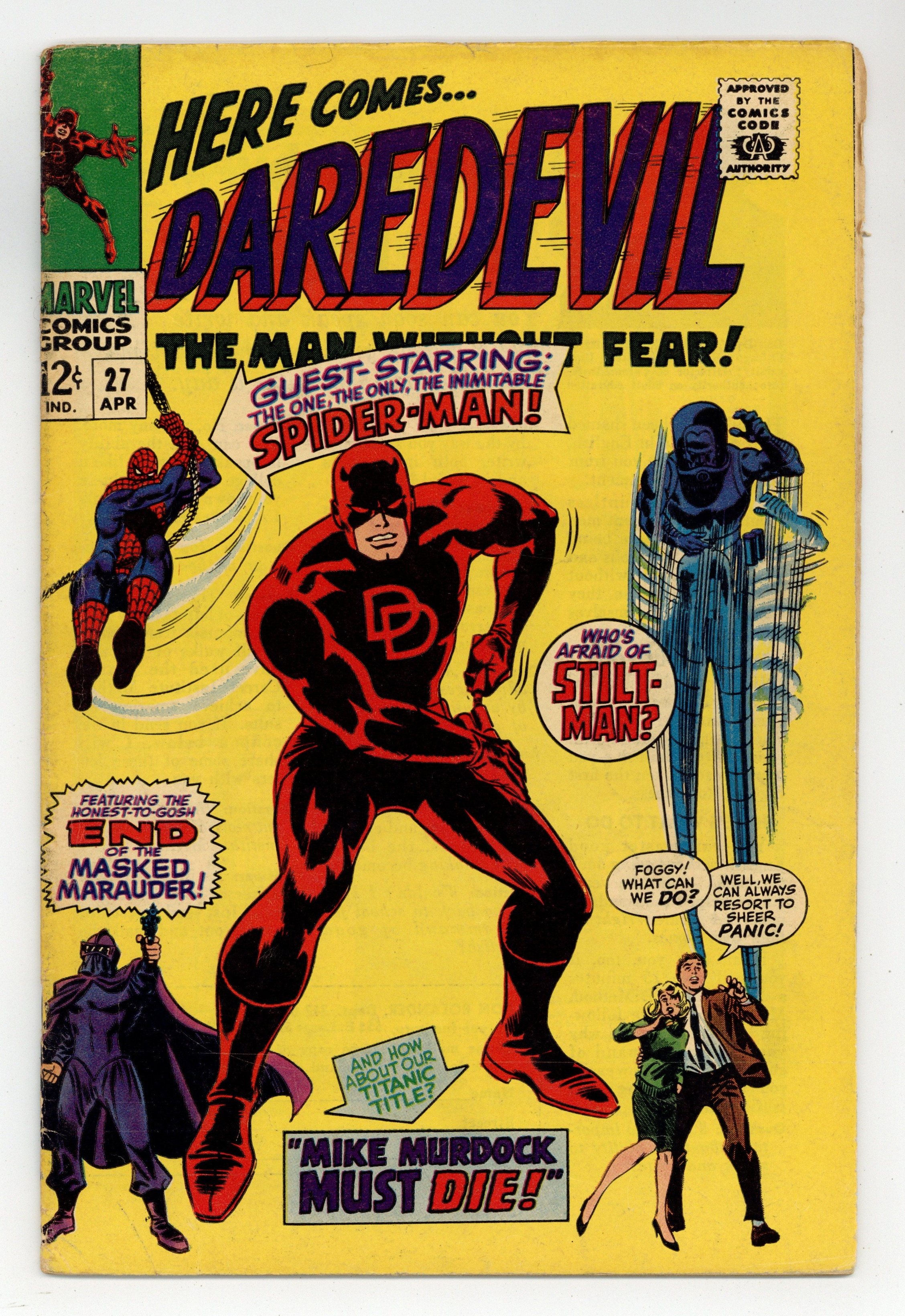 Starts Apr 4 Cover pencils by John Romita, inks by Frank Giacoia. Spider-Man guest stars in Enter Spider-Man!, script by Stan Lee, pencils by John Romita Sr., inks by Frank Giacoia (as "Frank Ray"); The Masked Marauder comes up with a plan to pit Spidey and DD against each other while he makes off with an experimental engine; First appearance of the Masked Marauder. Letter to the editor from comics retailer Bud Plant. 36 pgs. 36 pgs. Cover price $0.12. Cover price $0.12.