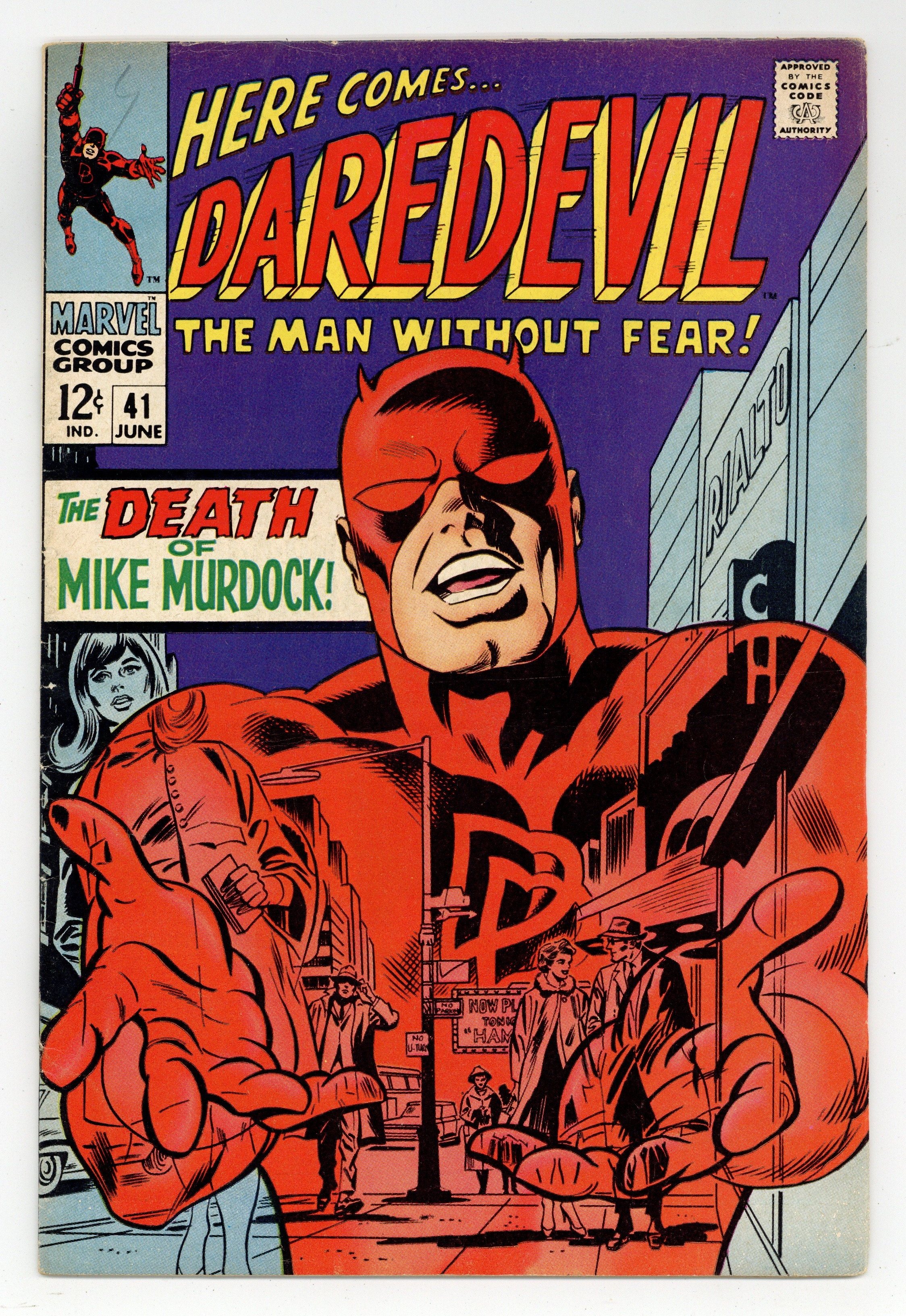 Starts Mar 23 Cover pencils by Gene Colan, inks by Frank Giacoia. The Death of Mike Murdock, script by Stan Lee, pencils by Gene Colan, inks by John Tartaglione; Daredevil returns from the time displacement limbo just in time to save Foggy from the Exterminator and the Unholy Three while killing off his Mike Murdock alter-ego in the process; appearances by the Ape Man, Bird Man, and Cat Man. Letter to the editor from writer Peter Sanderson. 36 pgs. Cover price $0.12. Cover price $0.12.