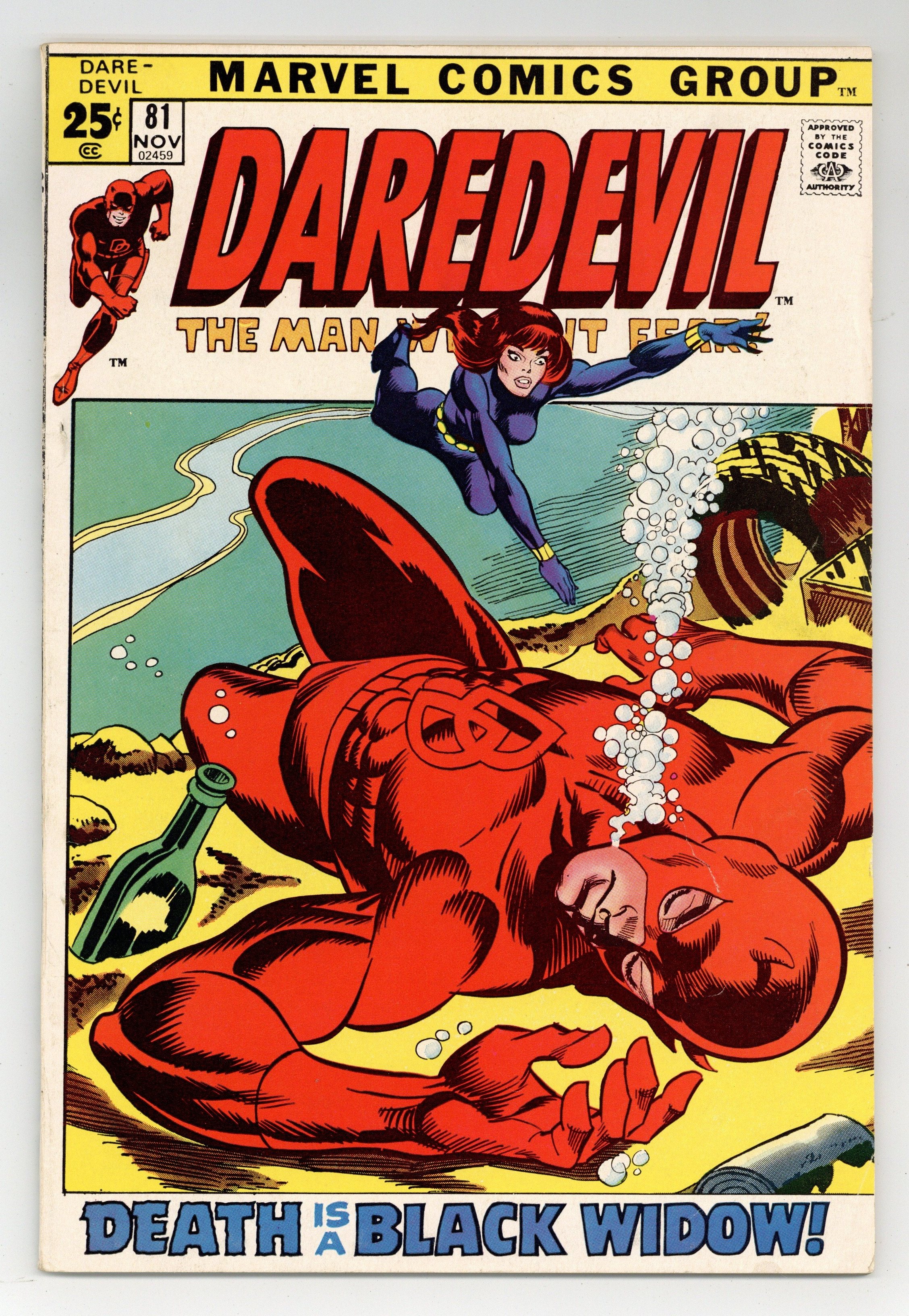 Starts Mar 23 Giant-size issue. Cover pencils by Gil Kane, inks by Frank Giacoia. And Death Is a Woman Called Widow, script by Gerry Conway, pencils by Gene Colan, inks by Jack Abel; Black Widow saves DD from drowning and then the two of them take down the Owl; Mr. Kline is revealed to be the robot MK-9 who refers to himself by the code name "Assassin." Black Widow pin-up by Bill Everett. This issue also contains a Fantastic Four reprint from Strange Tales 132, The Sinister Space Trap!, script by Larry Ivie, pencils by Bob Powell, inks by Mickey Demeo. 36 pgs. Cover price $0.25. Cover price $0.25.