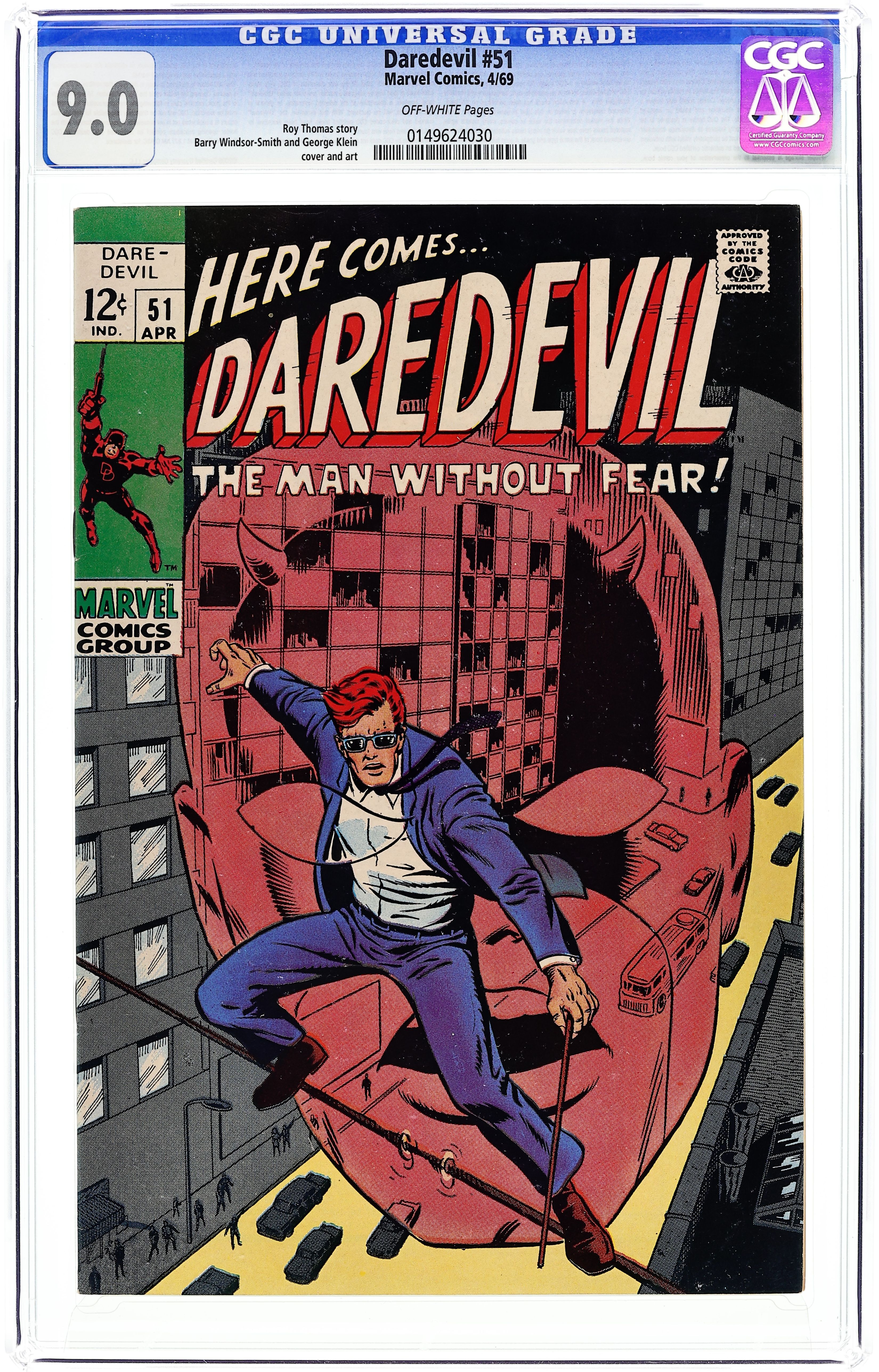 Cover pencils by Barry Windsor-Smith and John Romita (re-touches), inks by George Klein and John Romita (re-touches). Run, Murdock, Run!, script by Roy Thomas, pencils by Barry Windsor-Smith, inks by George Klein; While DD is battling his nefarious Plastoid robot, Starr Saxon invades Matt Murdock's apartment and finds out the he and Daredevil are on and the same; Determined to end his career as DD, Matt tries to patch things up with Foggy and Karen; Starr begins to hound Matt; Matt begins to have weak spells as doctors discover he is dying of radiation poisoning; Captain America cameo. Letter to the editor from comics writer Don McGregor. 36 pgs. Cover price $0.12. Cover price $0.12.