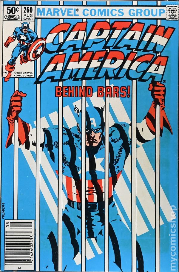 Newsstand Edition. "Prison Reform!" Script by Al Milgrom. Pencils by Alan Kupperberg. Inks by Frank McLaughlin (pp. 1-18) and Al Milgrom (pp. 19-22). Cover by Al Milgrom. The new warden at the state penitentiary (from Tales of Suspense #62) has an idea to test the prison's high-tech security system! He wants to incarcerate Captain America (voluntarily) and see if the Living Legend can escape. Of course, escaping is a piece of cake for the star-spangled avenger! But before Cap leaves the facility, he challenges prison politics and cleans up the rec yard riffraff! Cameo appearances by Clark Kent and Jimmy Olsen. (Notes: This cover is among a trio of Marvel covers in the early 1980s that featured super-heroes behind bars. See Amazing Spider-Man 219 and Avengers 224 also.) 36 pages. Cover price $0.50.